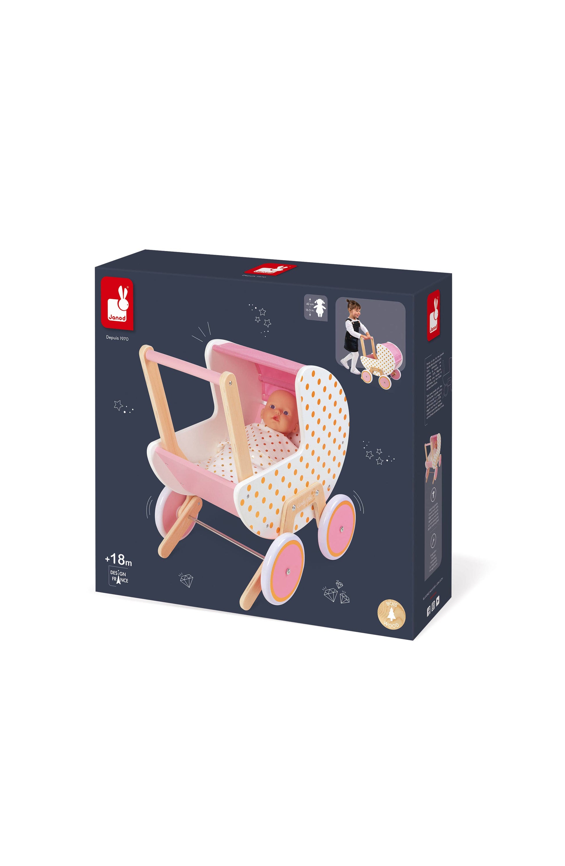 Wooden toy. For children aged 18 to 36 months. A realistic replica of a stroller, this wooden toy is ideally suited to accompany your child's first explorations of the world. Little girls will enjoy imitating older children as they take their dolls and stuffed toys for a stroll. Silent rubber wheels that do not make marks on the floor. For optimal safety, the Candy Chic stroller is equipped with a removable anti-tip system that you may remove once your child feels more at ease with walking. It comes with a lovely blanket and a golden polka dot pillow for a comfortable setting for cuddly toys and dolls. The wheel axles are made of metal for added sturdiness, with a fabric top. Compatible with dolls of up to 42 cm (Doll sold separately). Delivered not assembled. Wood: MDF and plywood. Printing: silkscreen. Closed color box.