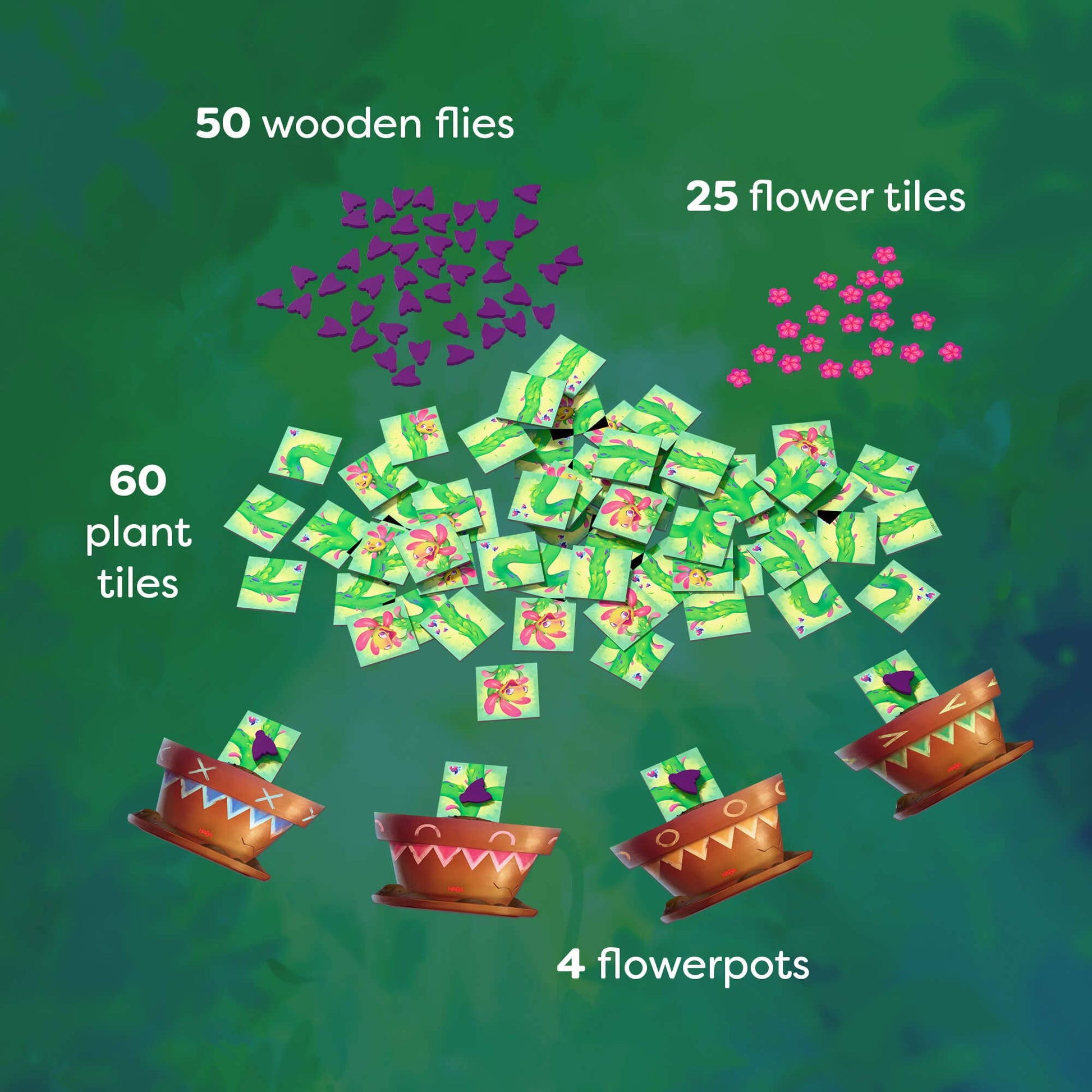 * Beautiful Game Components: Includes 60 plant tiles, 25 flower tiles, 4 flower pots, and 50 wooden flies.