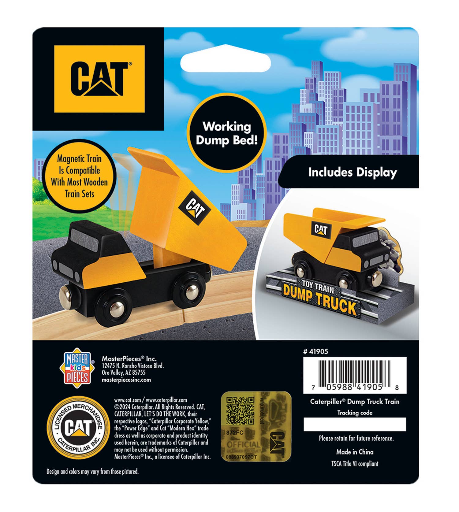 Officially licensed CAT Dump Truck Wooden Toy Train Engine. The CAT Dump Truck Train is compatible with most 1" wooden train tracks and has a working dump bed that tilts.