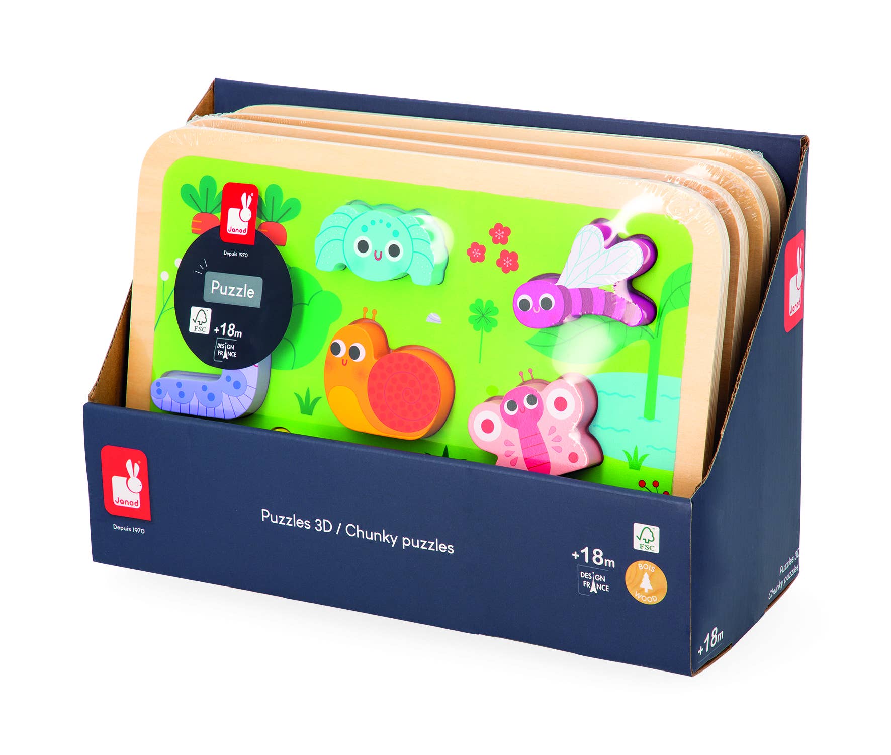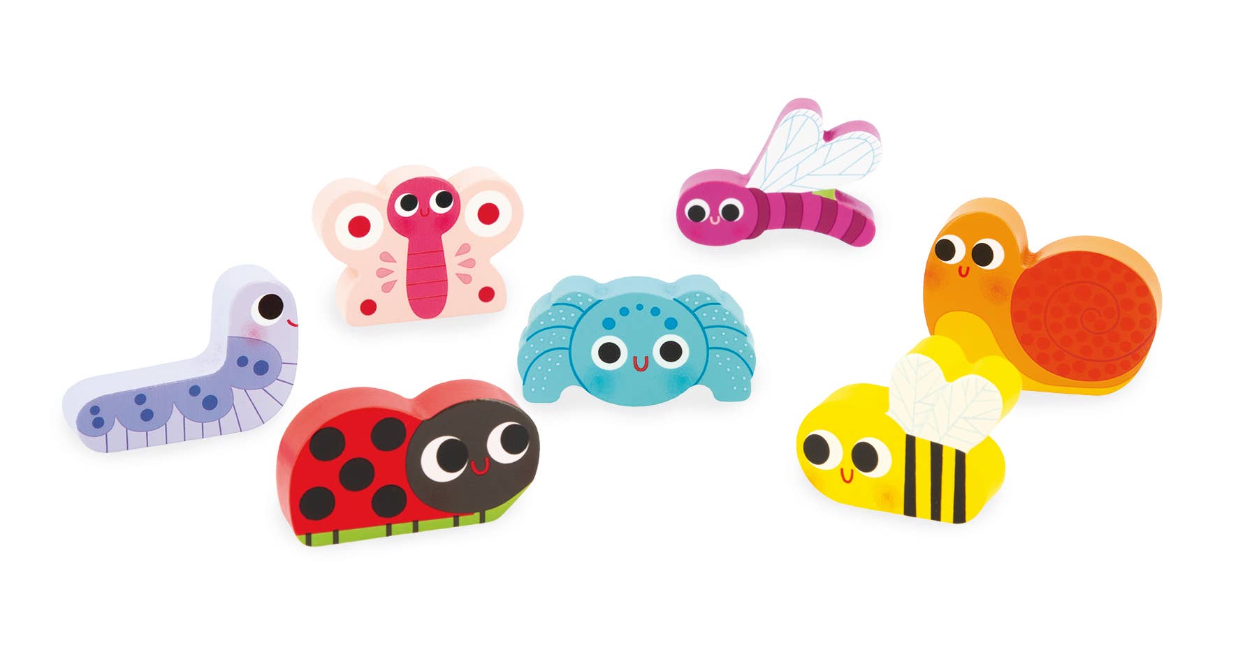 Spring is here: it’s time to watch the foraging bee or even this pretty colorful butterfly! Children will discover all kinds of garden animals and plants with this chunky wooden puzzle. The thick pieces have been designed to be easily grasped by little hands. Furthermore, little ones can either correctly position the 7 pieces on the wooden board or use them as figurines. This puzzle is ideal for developing fine motor skills and promoting imagination. Wood puzzle with water-based paint. Early-learning toy for children aged 18 months and up.