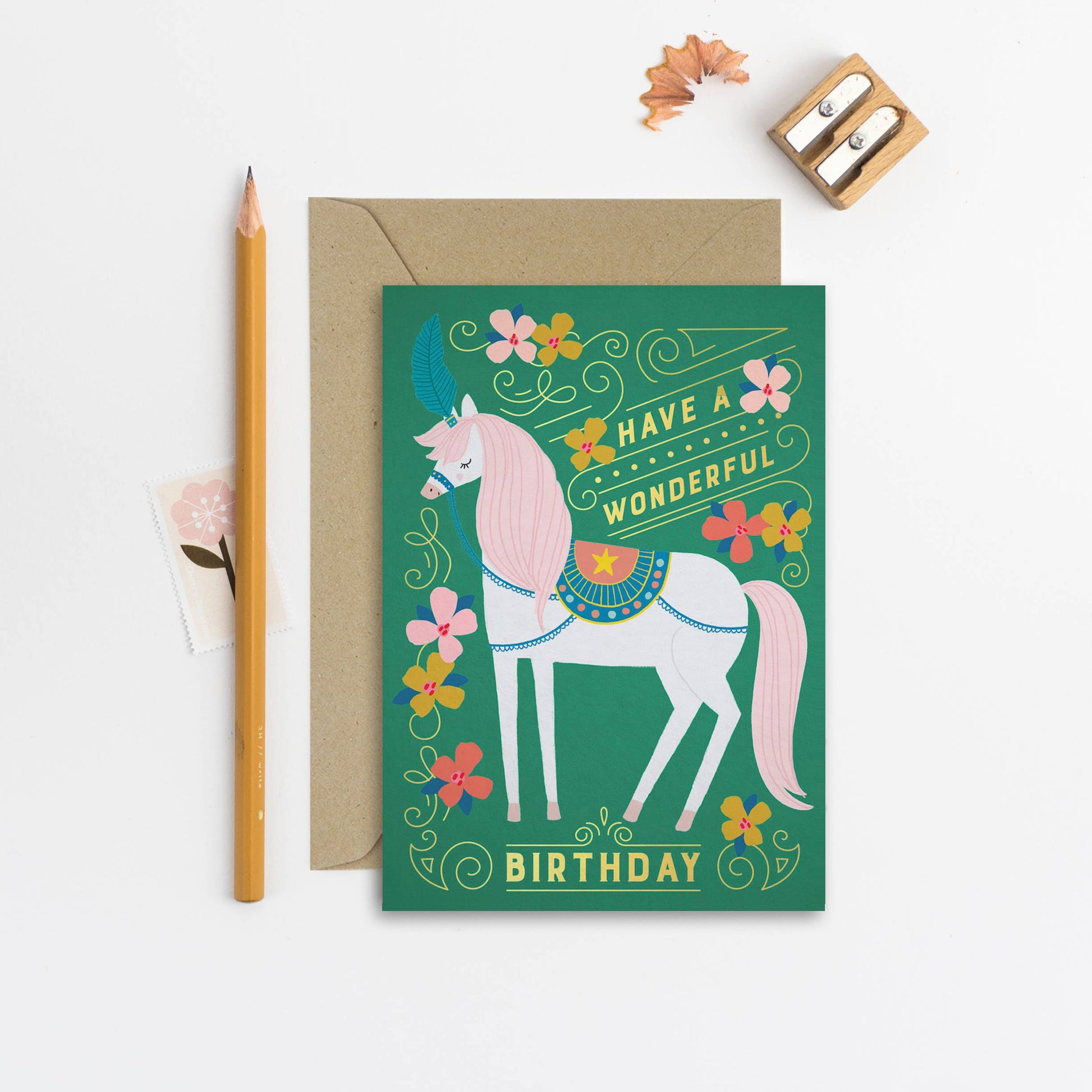 A birthday is the best day for horsing around! Wish your favourite horse fan a happy birthday with this illustrated children’s birthday card. Featuring a beautiful white horse with a pink mane with gold foil details and caption reading “Have a Wonderful Birthday”, this special kid’s birthday card is sure to start the party. Add a handwritten message to the blank inside of the birthday card for a personal finish.