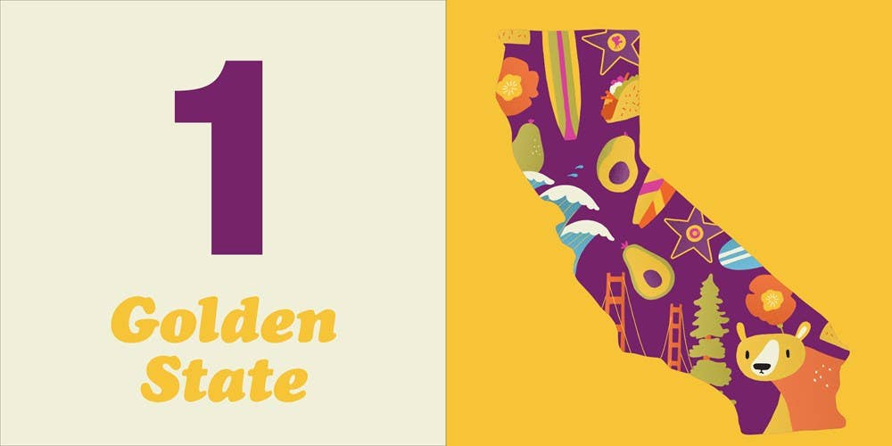 Covering everything from grizzlies to avocados, surfboards to stars on the Walk of Fame, this bright board book makes learning about California as easy as 1, 2, 3! Illustrator Nicole LaRue’s charming, modern style depicts iconic Golden State symbols for toddlers to count. A perfect baby gift or vacation souvenir, this fresh and contemporary take on the 31st state will be a hit with little learners.