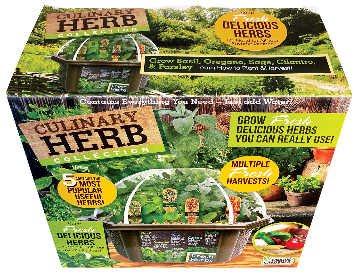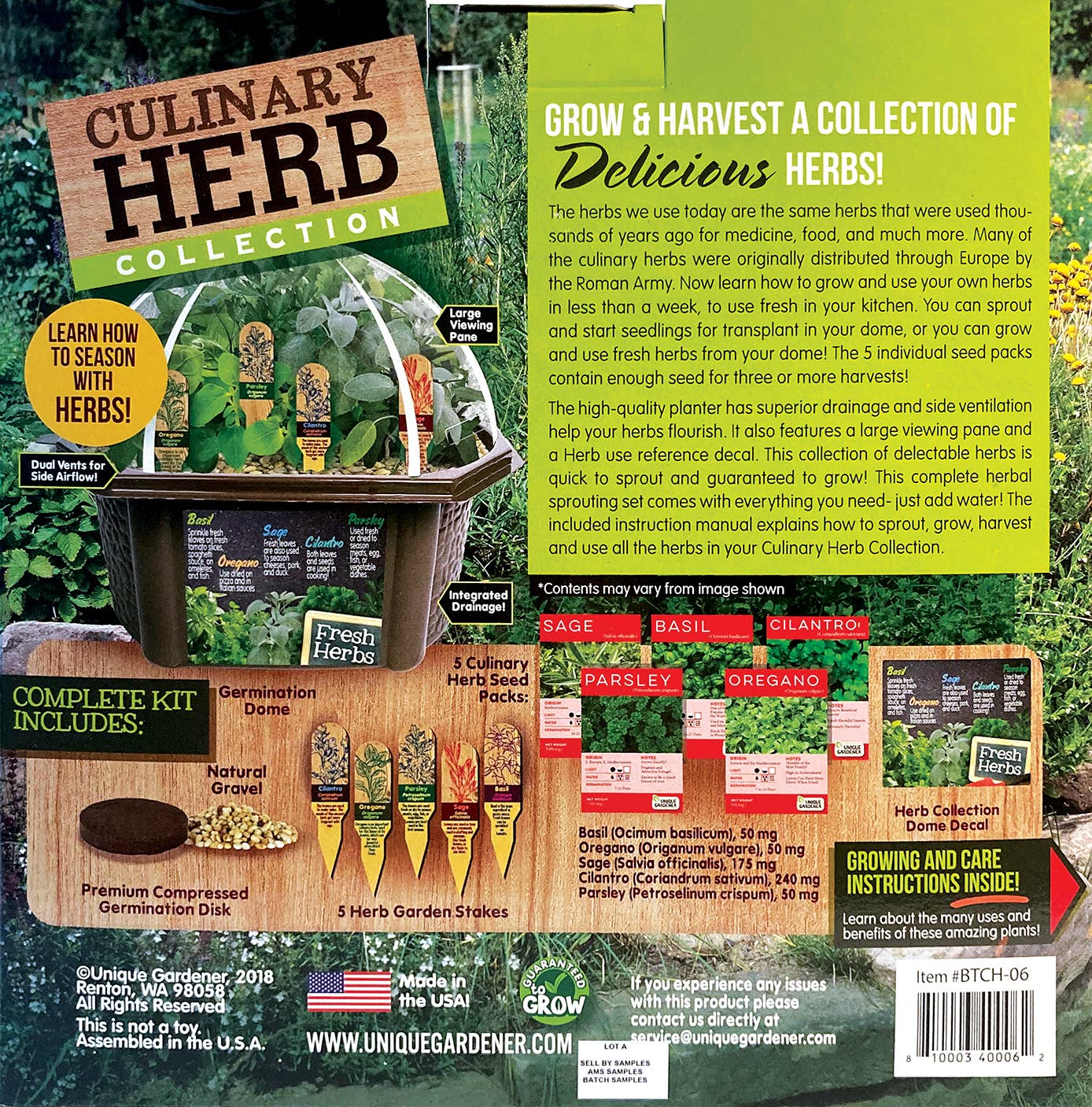 The high-quality planter has superior drainage and side ventilation help your herbs flourish. It also features a large viewing pane and a Herb use reference decal. This collection of delectable herbs is quick to sprout and guaranteed to grow! This complete herbal sprouting set comes with everything you need- just add water! The included instruction manual explains how to sprout, grow, harvest and use all the herbs in your Culinary Herb Collection.