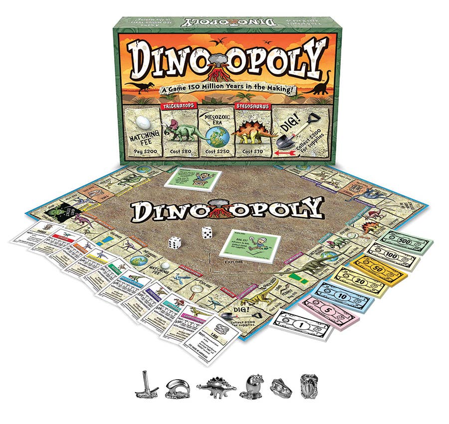 Go back in time with Dino-Opoly. This new design of the classic board game lets you follow in the ancient footsteps of dinosaurs who ruled the planet for 160 million years! Show your brave heart and discover the mysteries of these magnificent creatures without getting extinct. Let's play! 🦕