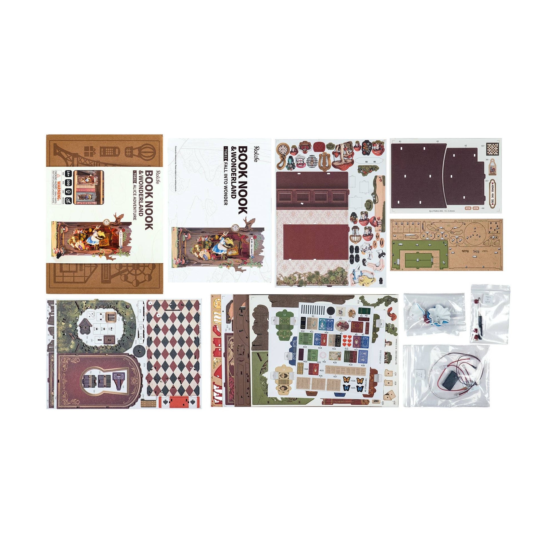 Step into the pages of a beloved classic with this DIY miniature book nook kit, a magical tribute to curiosity, whimsy, and wonder. As you build, watch Alice tumble gracefully down the rabbit hole, surrounded by a swirling flurry of falling treasures-chessboards, teacups mid-pour, curious cupboards, and floating saucers-all frozen in that dreamy descent.