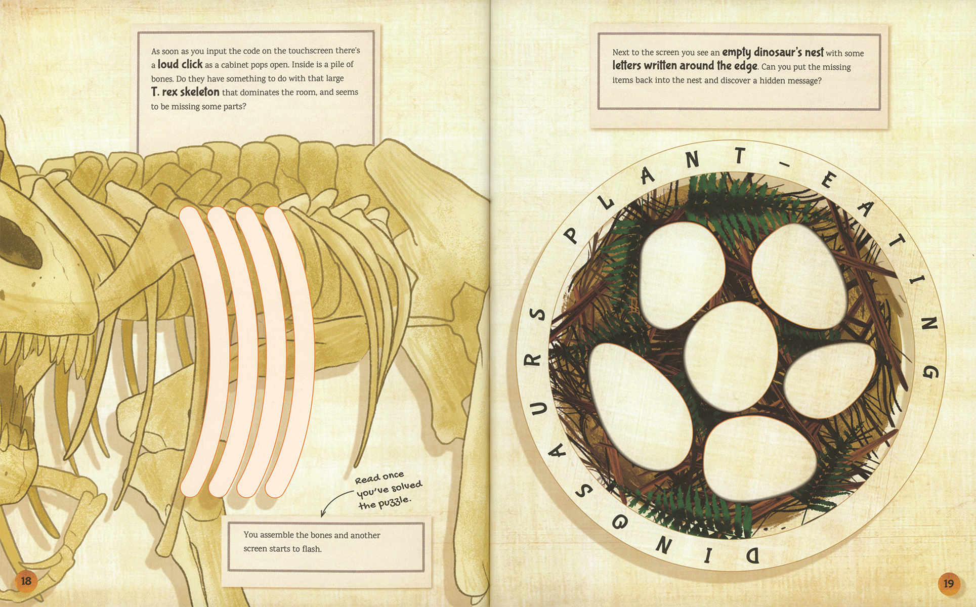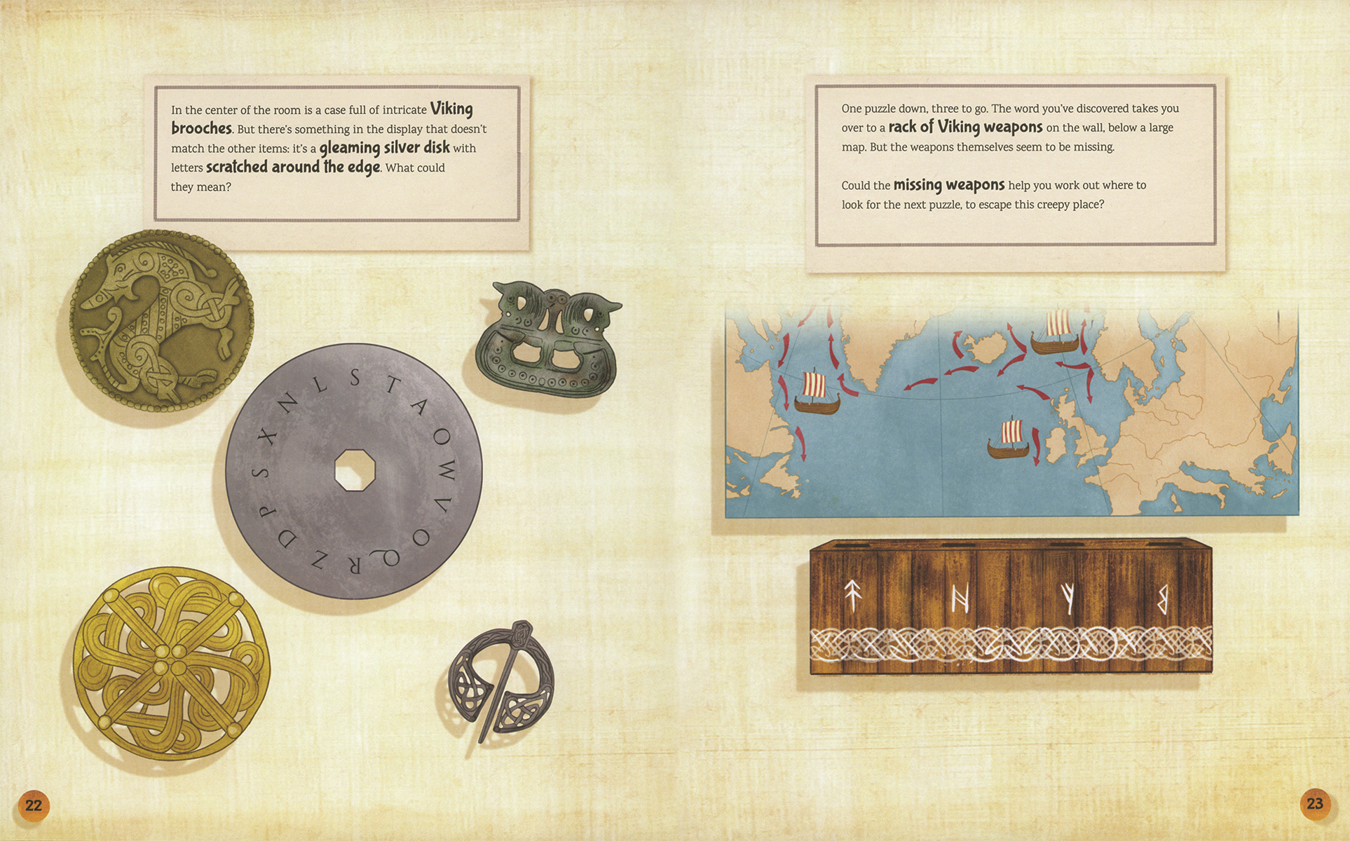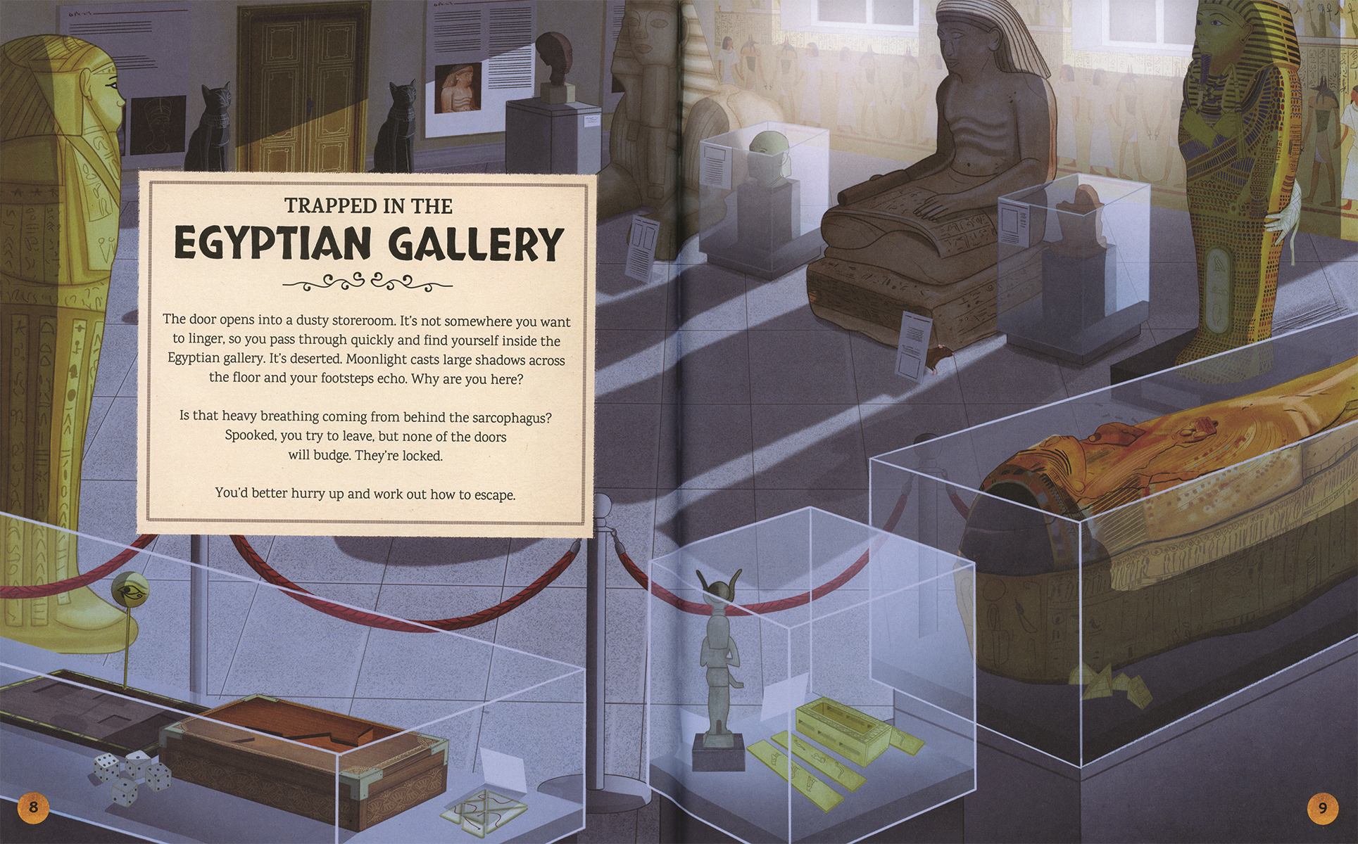 You’ll encounter terrifying dinosaurs, spooky Ancient Egyptians, vicious Vikings, amazing animals, fearsome knights, and even explore space as you find your way out of a series of mysterious museum galleries using the press-out pieces.