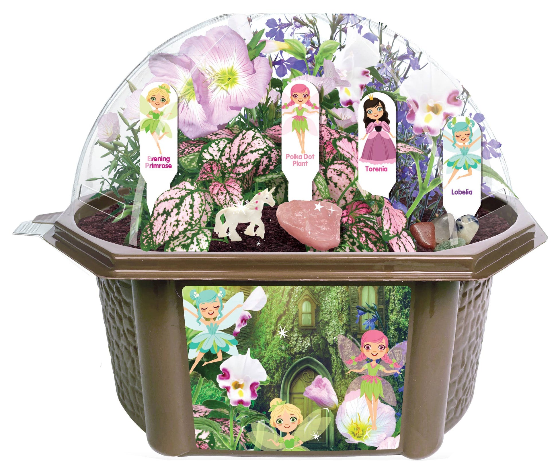 The high-quality planter has superior drainage and side ventilation help your magical fairy plants thrive. It also features a large viewing pane and a Fairy Wonderland Decal. This collection of enchanting plants is quick to sprout and guaranteed to grow! This whimsical and colorful kit comes with four special fairy plant varieties, multi-colored, sparkling fairy stones, rose quartz, and fairy stakes- just add water!