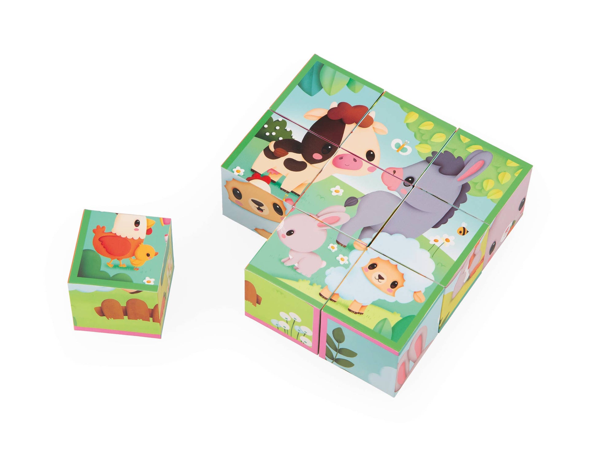 Come along to the farm and discover all the cute animals! Here are 9 cardboard cubes to create 6 scenes on the theme of farm animals: a sheep, a rabbit, a donkey, a cow, a hen with her chick and all the animals together. A colored border, different for each puzzle, is a valuable aid for children. Lightweight cubes that are easy to handle, perfect for developing the fine motor skills of little ones and the imagination of older children. For children aged 2 and over