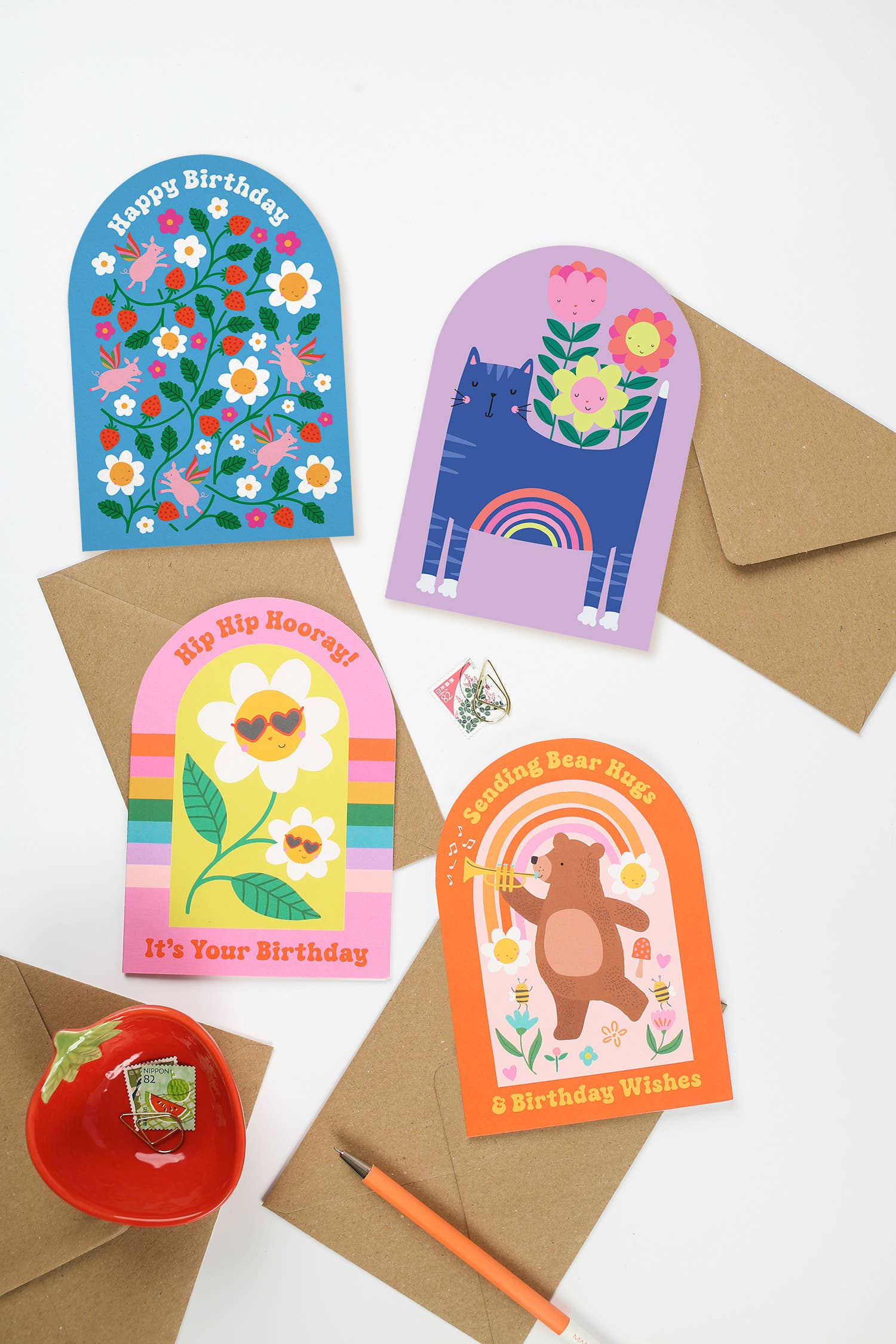 Featuring the coolest, sunglass-wearing flowers, this arched shaped birthday card is complete with a beautiful floral illustration on a lime green background, surrounded by a bright pink frame and finished off with beautiful rainbow stripes. The caption reads 'Hip Hip Hooray! It's Your Birthday' and the luxury card was designed and made in the UK .