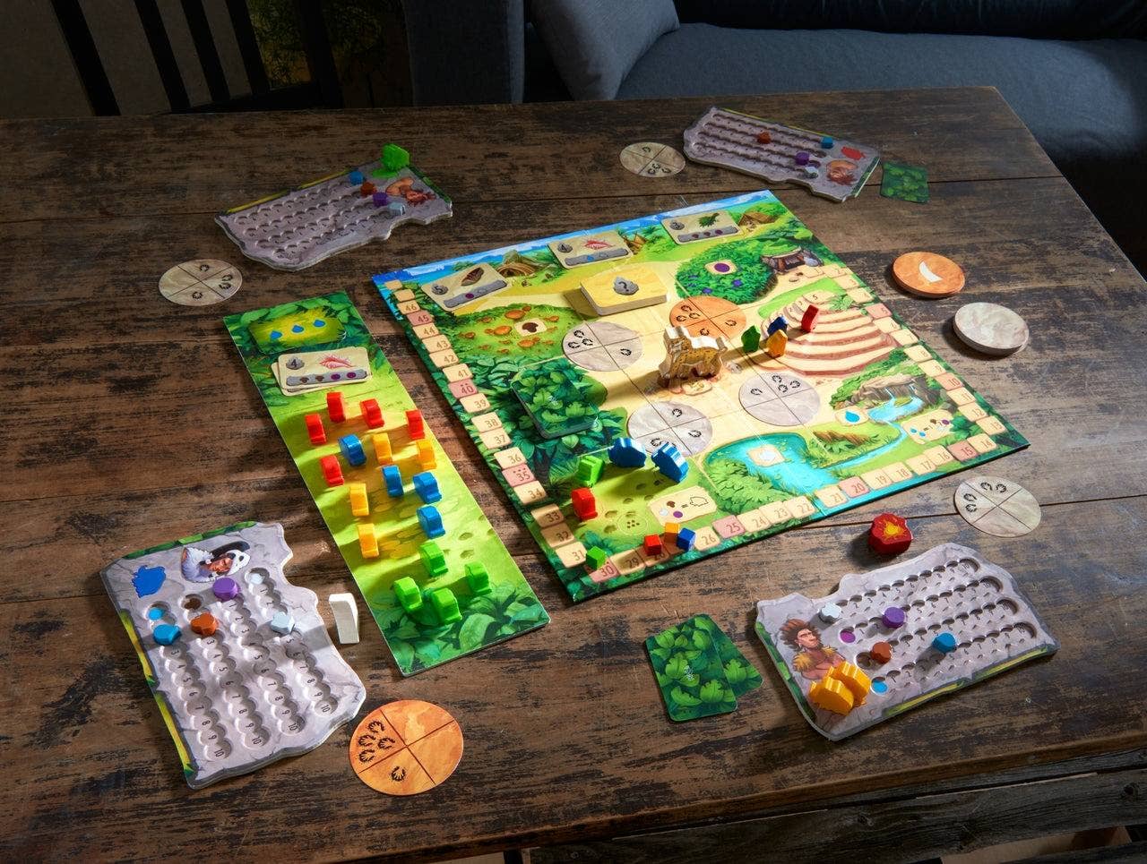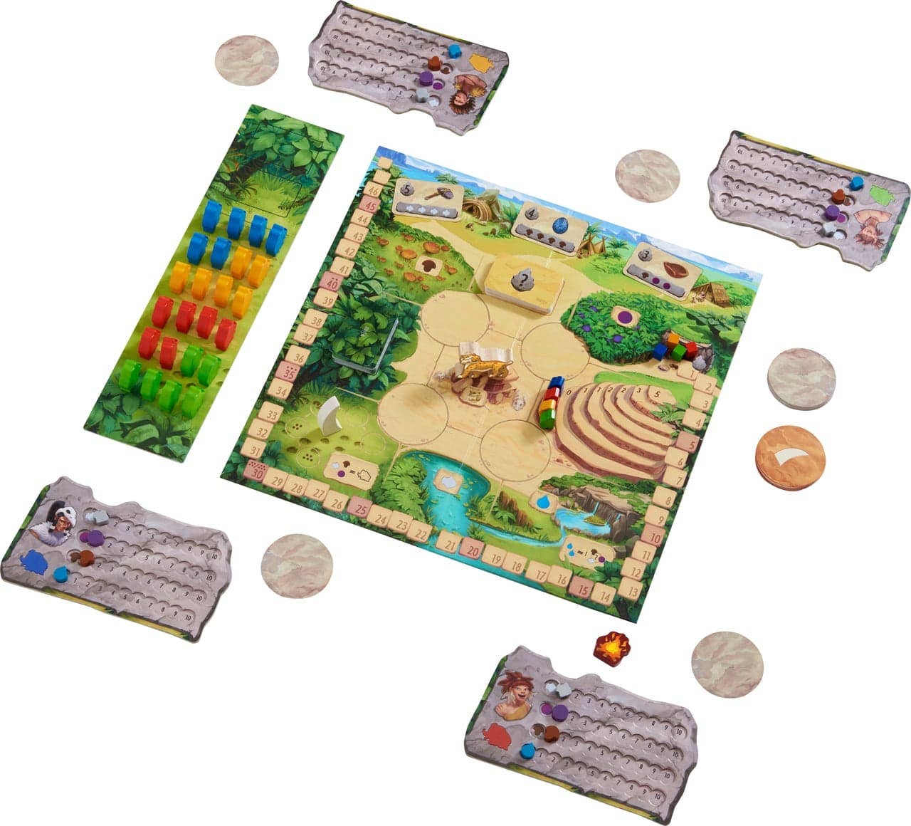 Number of Players: 2-4 Players Playing Time: 30-45 Minutes The saber-toothed tiger clan is looking for a new leader! Only the caveman who collects the most supplies, barters successfully and pays homage to the old nature gods will ever prove worthy. But you must never under any circumstances forget to do one thing: take care of Honga! Because whoever neglects the saber-toothed tiger will have their supplies eaten up by him. A saber-toothed tiger-powerful tactical game. * Collect resources to move the cavemen up the sacred mountain, lure mammoths to the tribe, complete trade agreements and more. * Make sure to appease Honga or he will come steal your food! * For ages 8+. * Includes 5 player trays, 1 Honga figure, 1 depot board, 46 actions disks, 32 barter cards, 25 bonus cards, 1 mammoth tooth, 1 starting player fire marker, 30 mammoths, 5 cavemen, 5 scoring markers, 20 food markers and set of instructions.