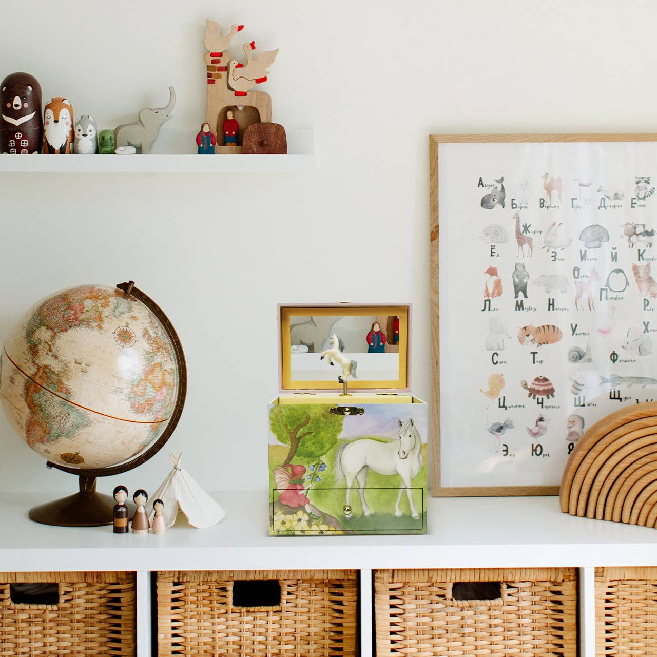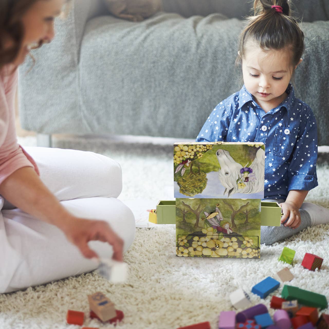 Retailers: Feature this large Horse Fairy music box for Christmas 2025 season. Showcases a moving horse figurine dancing to 'Invitation to the Dance', four secret treasure drawers, and enchanting watercolor art of fairies in flower fields. Measures 6x4x6 inches - premium size for displays. Perfect for storing sterling silver jewelry, TTRPG accessories, or collectibles.
