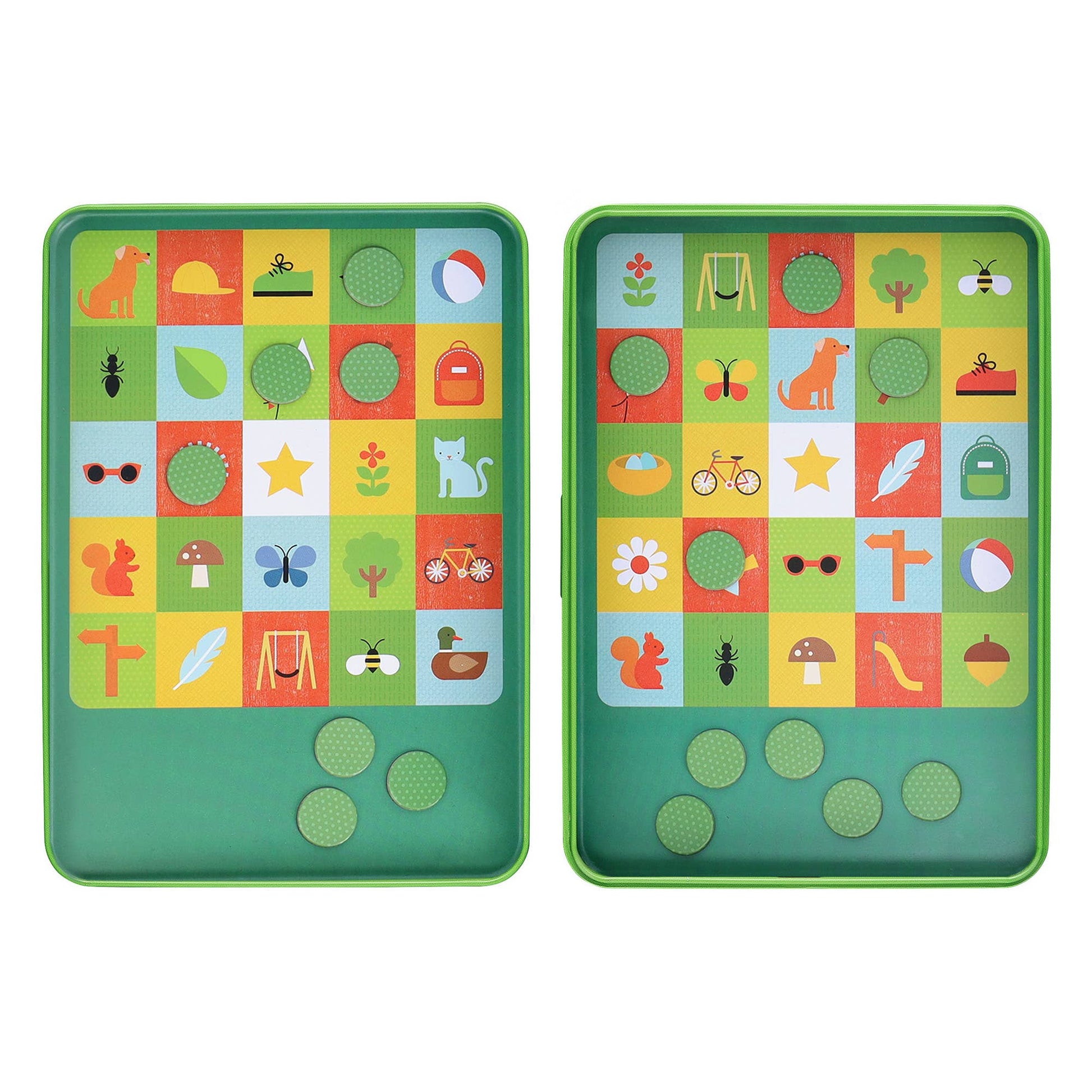 Bingo! A classic game with a magnetic twist for on-the-go fun! Spot a dog, a bike, or a ball, and mark it on your bingo sheet. Keep your eyes peeled as you enjoy a walk in the park. Perfect for ages 4+, 2 players, this set encourages little ones to go out into nature and enjoy a game of search and find, with the added fun of being the first to shout BINGO! Packaged in a convenient tin, the game is ideal for playing on the go. Includes two bingo boards and 50 magnetic markers. PORTABLE BINGO GAME – In-the-Park Bingo Magnetic Travel Game is a perfect companion for engaging kids while out and about. Try to be the first to spot five things in a row, such as a dog, butterfly, or kite. Keep your eyes peeled, then mark what you see on your bingo board.
