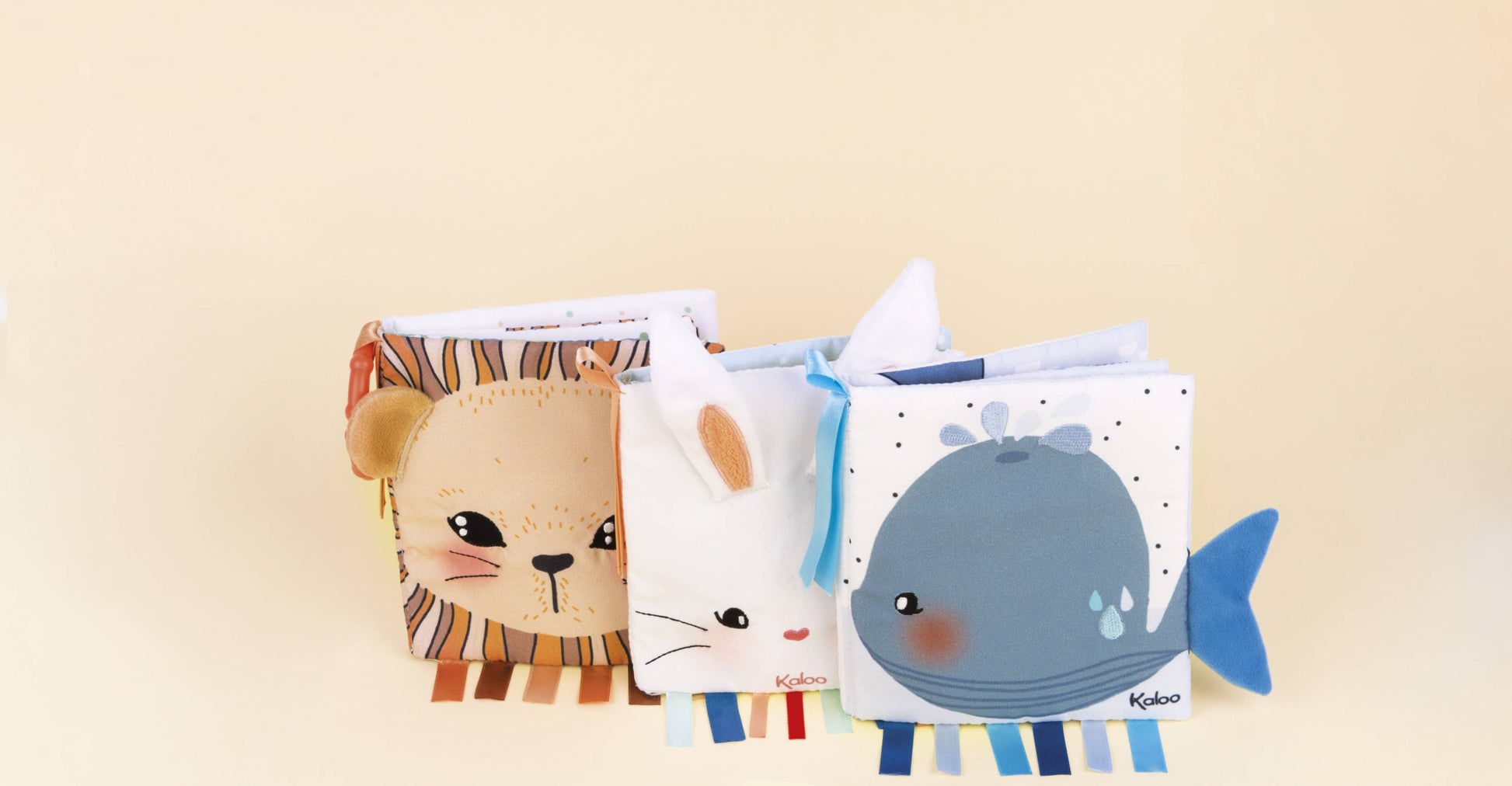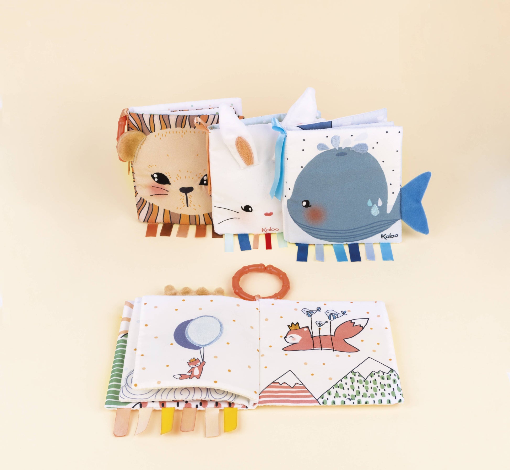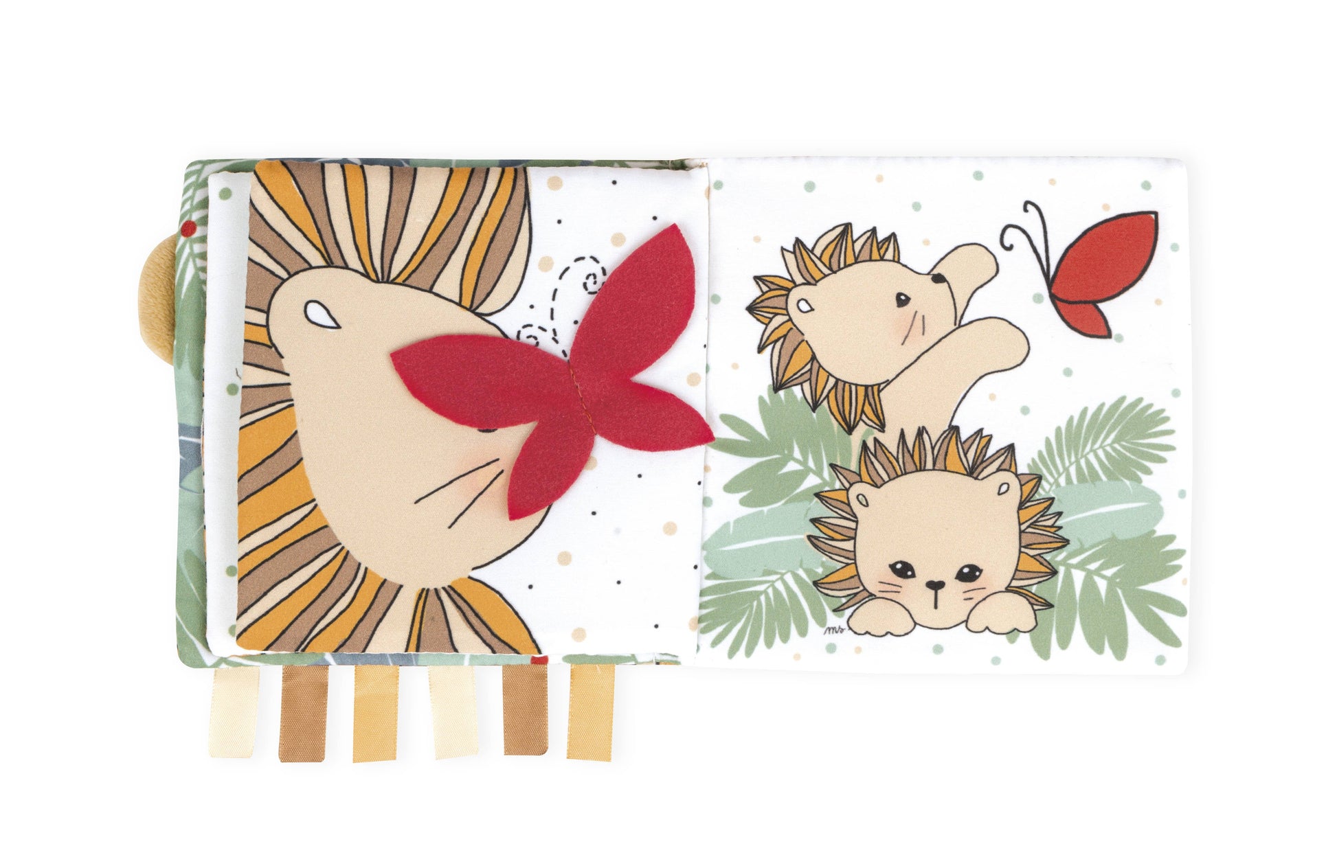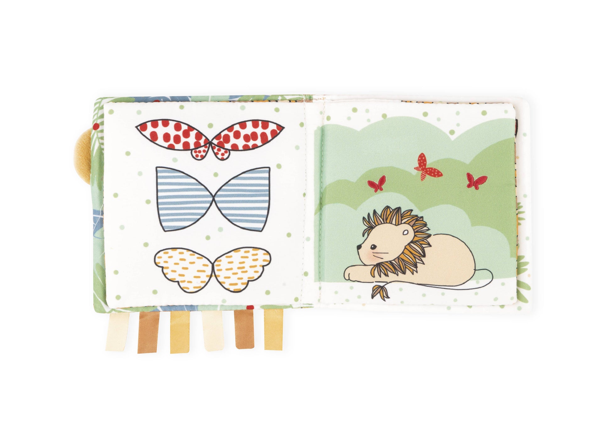 Take a journey to the heart of your emotions thanks to these very sweet books from Kaloo. Each 5.5 inch soft book has beautiful illustrations to look at, a story to tell, fabrics to stroke and amusing activities to stimulate baby’s senses so you can spend tender moments together. Discover the story of an oh-so-cute little lion cub who discovers nature and butterflies! This book has pretty illustrations with super-soft colors and materials, so you can tell baby wonderful stories and teach your baby to be curious about the world around us! Includes: a clip-on lamb and ribbons to grab!