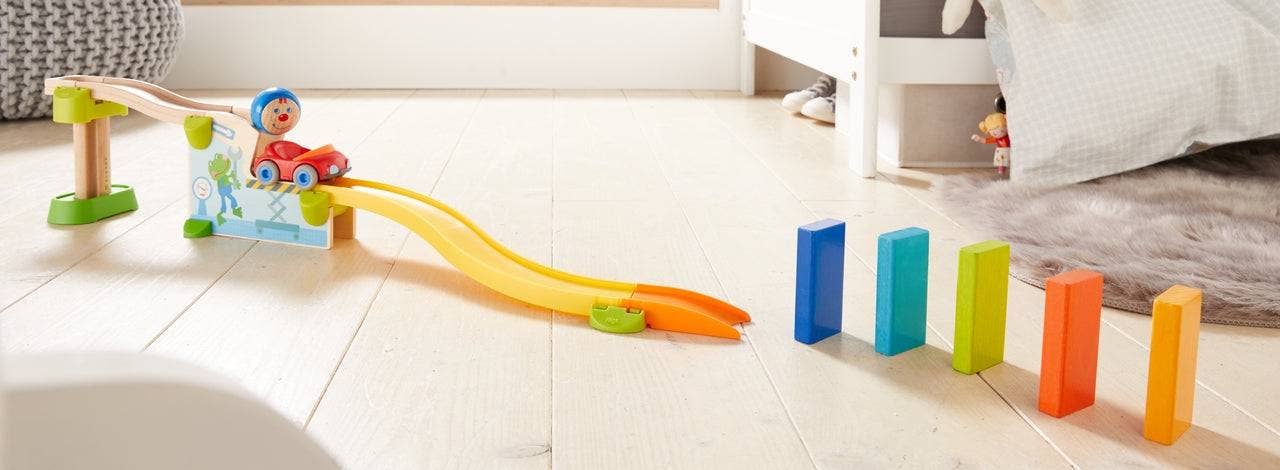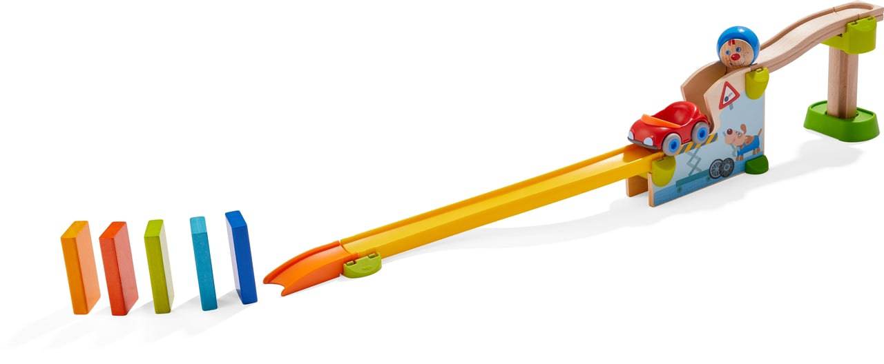 Watch as the Bret Boomer jumps into the car and races off on the track. This set makes a great addition to an Kullerbu set.