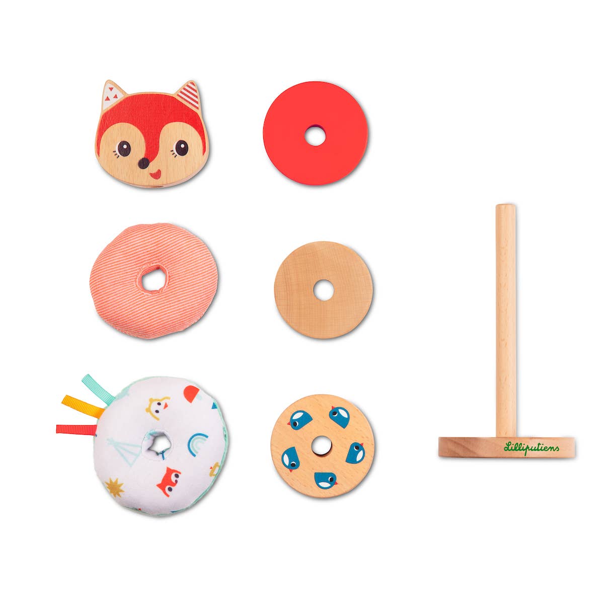 Cheerful stack pyramid to hone fine motor skills. Stack the components in a creative way. The different materials and colors stimulate the senses.