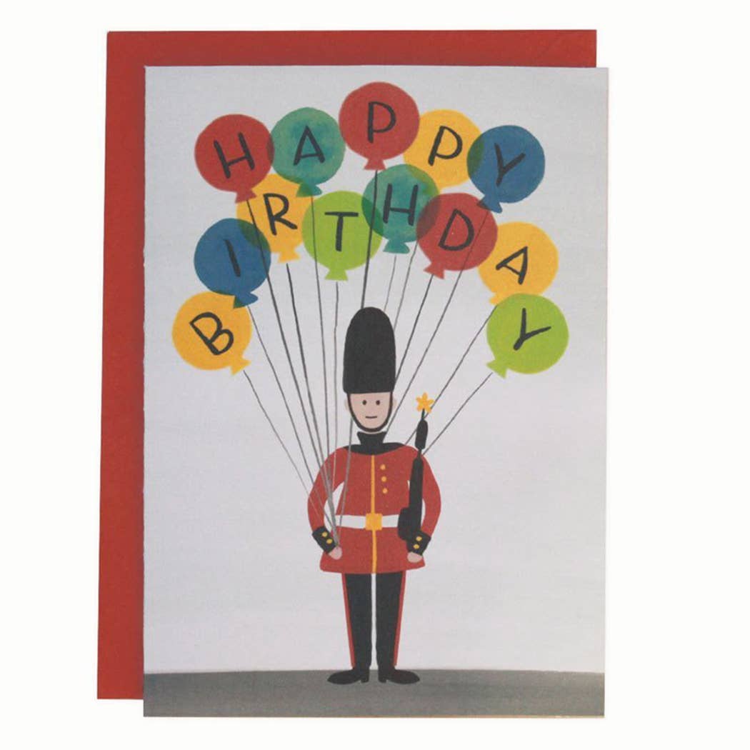 This whimsical birthday card is inspired by the stoic, silent, and immovable London Guards of Buckingham Palace.