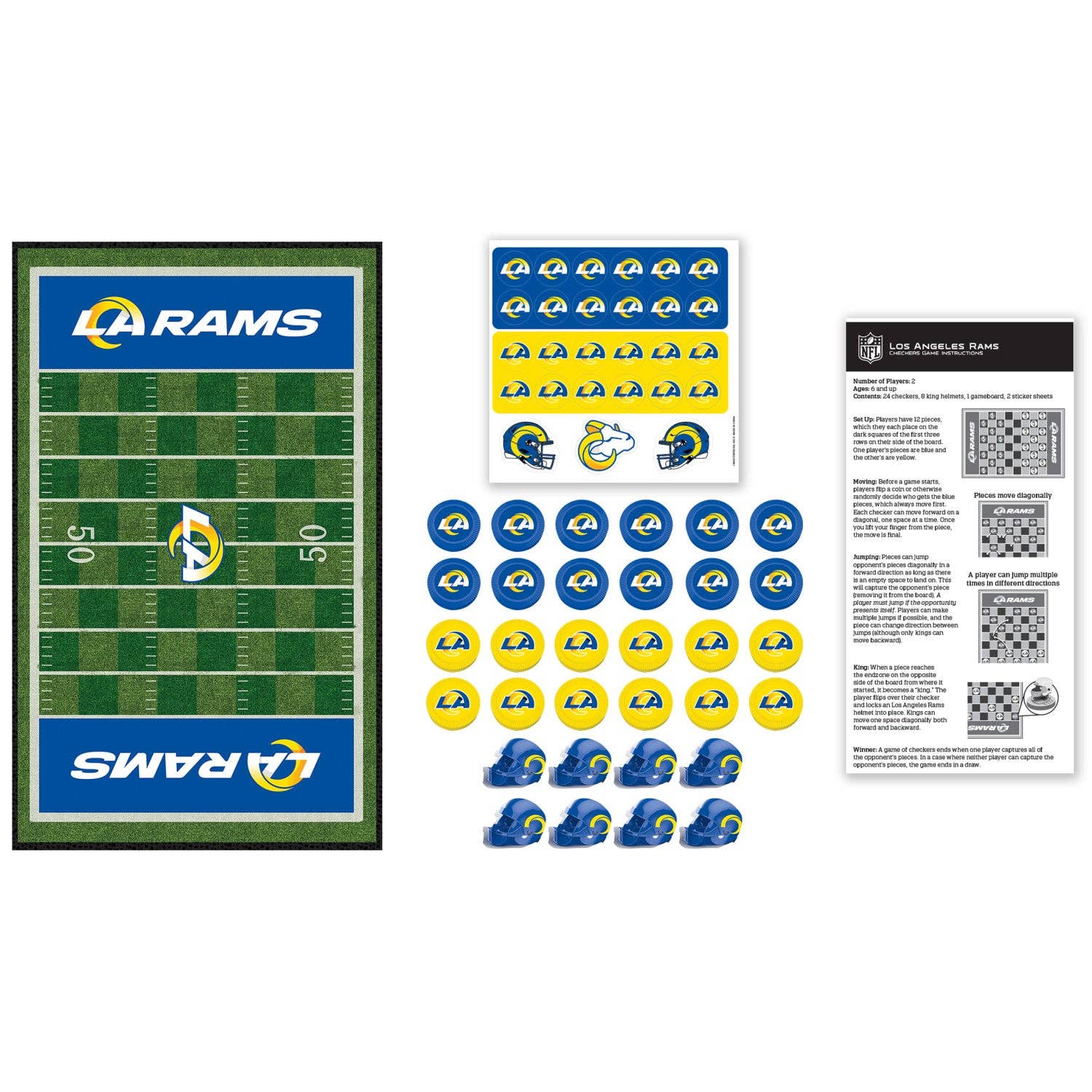 If you're a fan of the Los Angeles Rams, then you're going to love this officially licensed MasterPieces NFL Los Angeles Rams Checkers Board Game. This classic game of checkers is a ton of fun for children and adults ages 6 and up, and it's a great way to show your Los Angeles Rams pride. This checkers game comes with 24 Los Angeles Rams checkers pieces, 8 football helmet king pieces, a 13 inches x 21.375 inches game board, 1 sticker sheet, and an instruction sheet. So get ready to put your skills to the test and crown yourself the checkers champion!