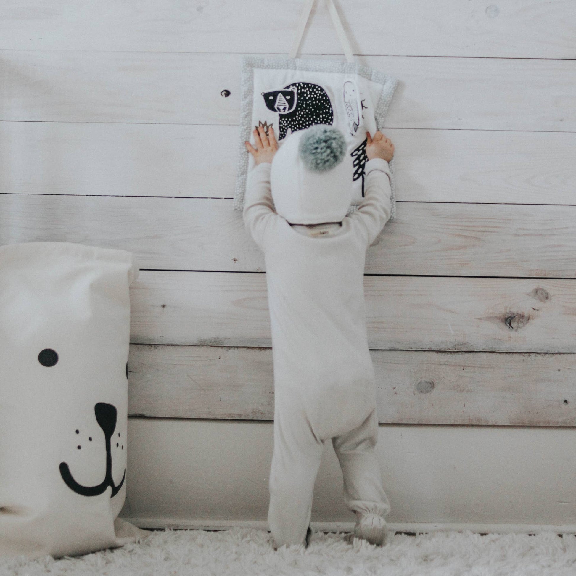 The Woodland Activity Pad keeps baby stimulated with a variety of sensory stimulation with high contrast graphics, and hidden items including crinkly features, a rattle, a squeak and a maple wood teething ring hidden in a pocket behind the bear.