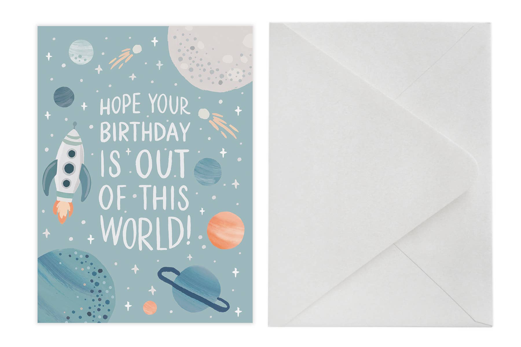 This birthday card with spaceship shooting into outer space, planets, stars and moon is the perfect way to say, "Hope Your Birthday is Out of this World!"