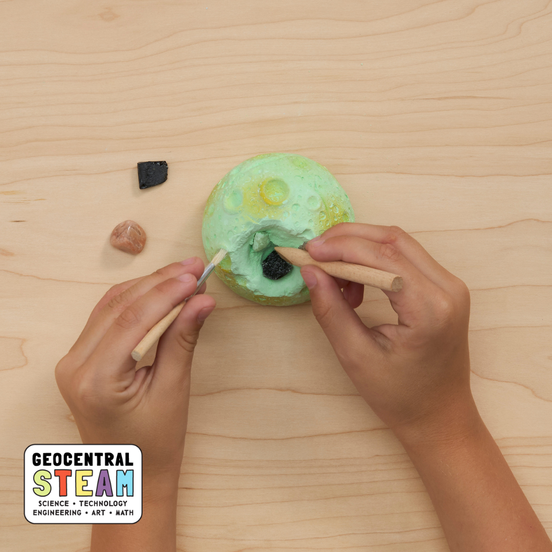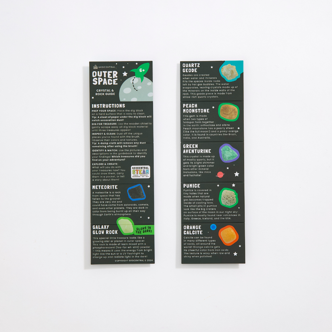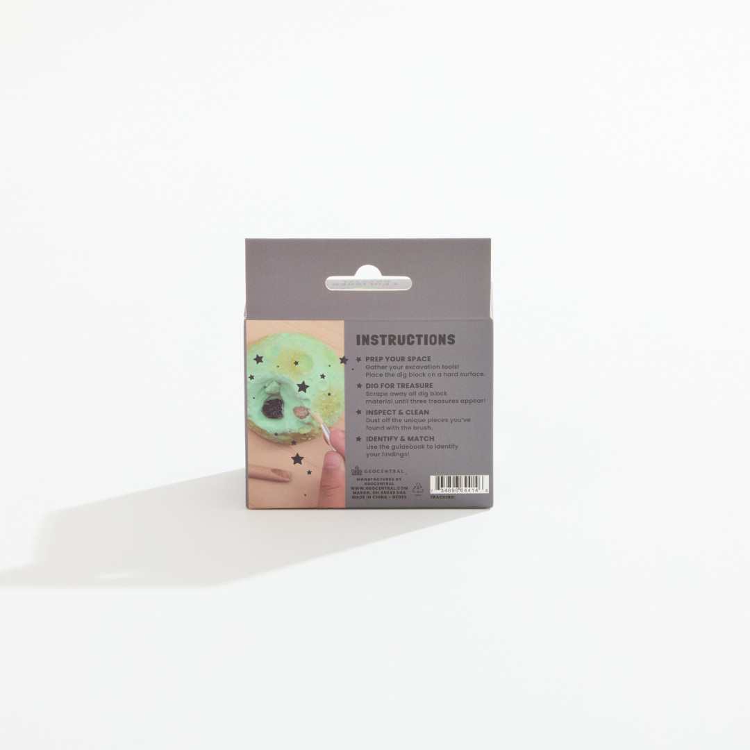 - The Outer Space Dig Kit features a custom green moon dig block made of premium quality, lightweight plaster. - Each block contains three treasures – one matte glow rock, one polished crystal, one rough crystal – and comes with a chisel and brush. - Treasures can be identified with the included guidebook. Possible treasures include: - black meteorite - matte glow rock - peach moonstone - green aventurine - pumice - orange calcite - quartz geode
