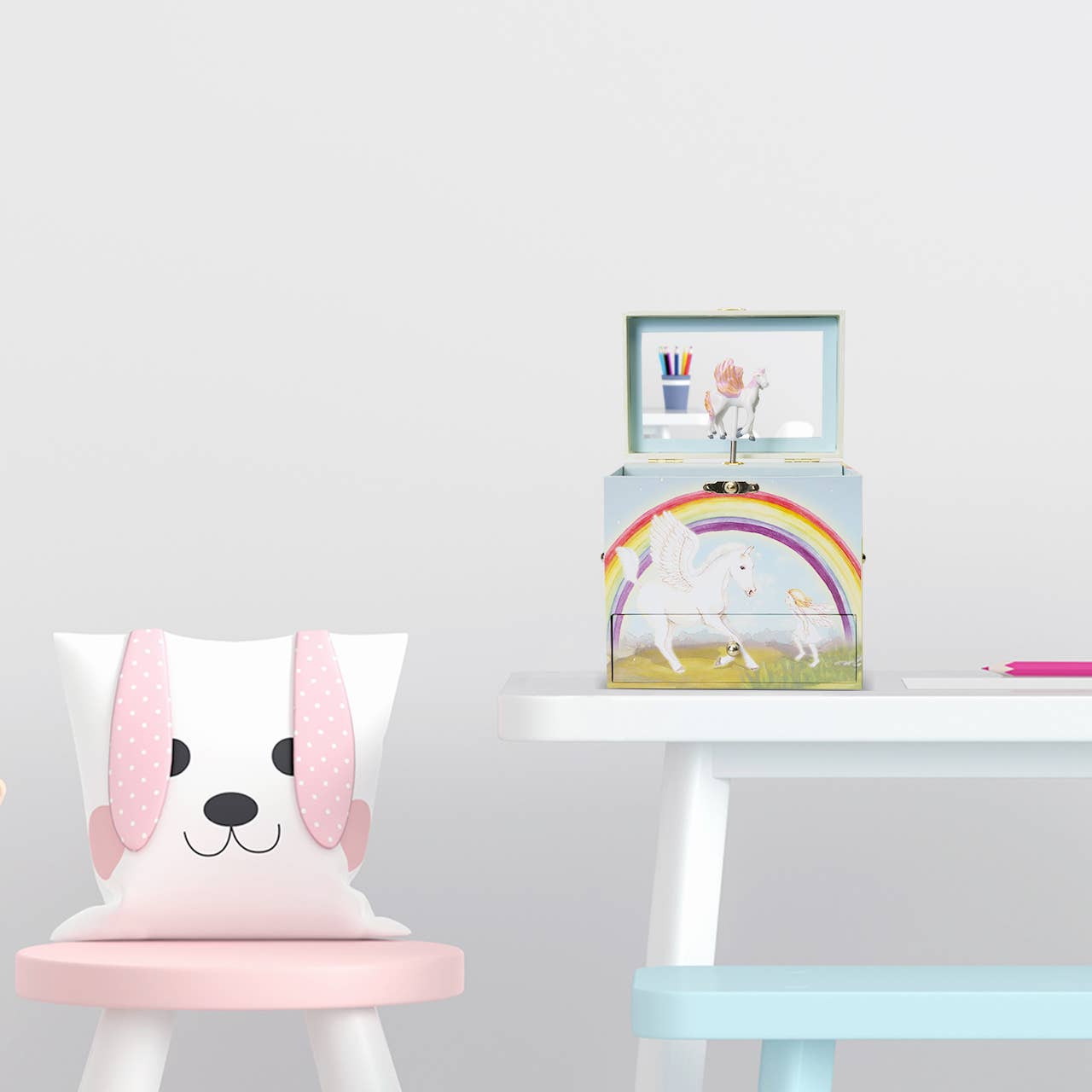 Beautiful and Versatile - Music jewelry boxes for girls feature fancy velvet flocked paper lining and painted outer finish with golden hinges and knobs which makes it perfect match for any room décor. Whimsical, water-colored illustrations foster art appreciation, and painted Pegasus that twirls as the Unicorn theme music plays.