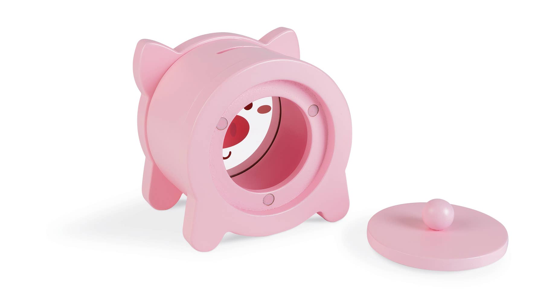 Wooden product An attractive piggybank to save coins and bills throughout the year. Your child will see them through the transparent part in front. And the magnetic opening located at the back makes it easy to recover them. It will make it fun to save up! Closed color box