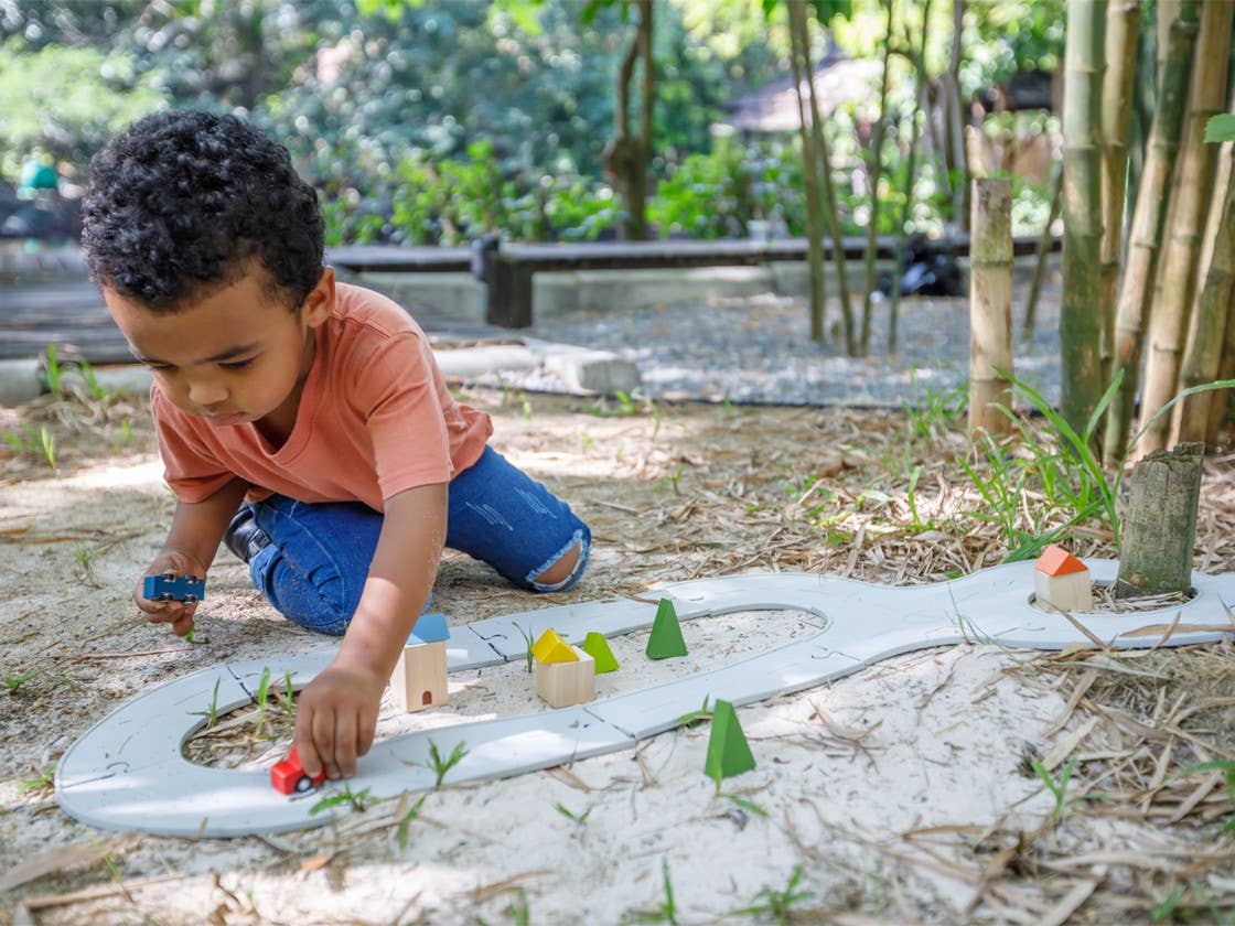 Pave your own path and go on a journey with the PlanToys Rubber Road & Rail set! The flexibility of the rubber allows kids to create unique city infrastructure for play the can not only be played with on flat surfaces but curved and inclined surfaces as well. This set comes complete with 11 pieces of two-sided rubber tracks, 2 cars, 3 buildings, and 3 bushes - 19 pieces in total. One side of the rubber tracks is design for cars and if you flip the tracks on onto the other side, there are train tracks.