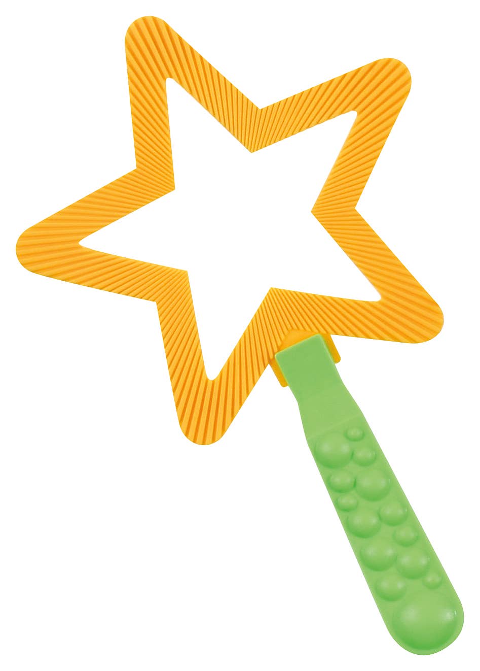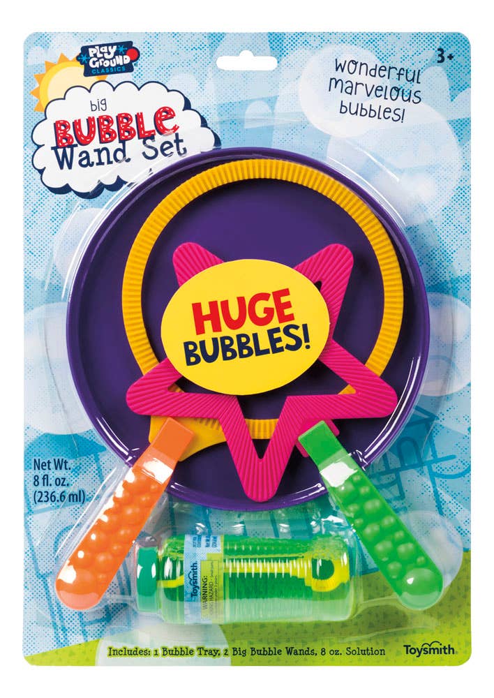 Big Bubble Wand Set includes 2 bubble wands with handles, a 9-inch diameter dipping tray, and 8 ounces of bubble solution with a bonus mini bubble-blowing wand inside. Each giant bubble wand has a different-shaped head, measures 7 inches long, and has a textured handle that makes the wand easy to grip. Includes 1 star bubble wand and 1 circle bubble wand. A bonus mini blowing wand is also included inside the jar of bubble solution.