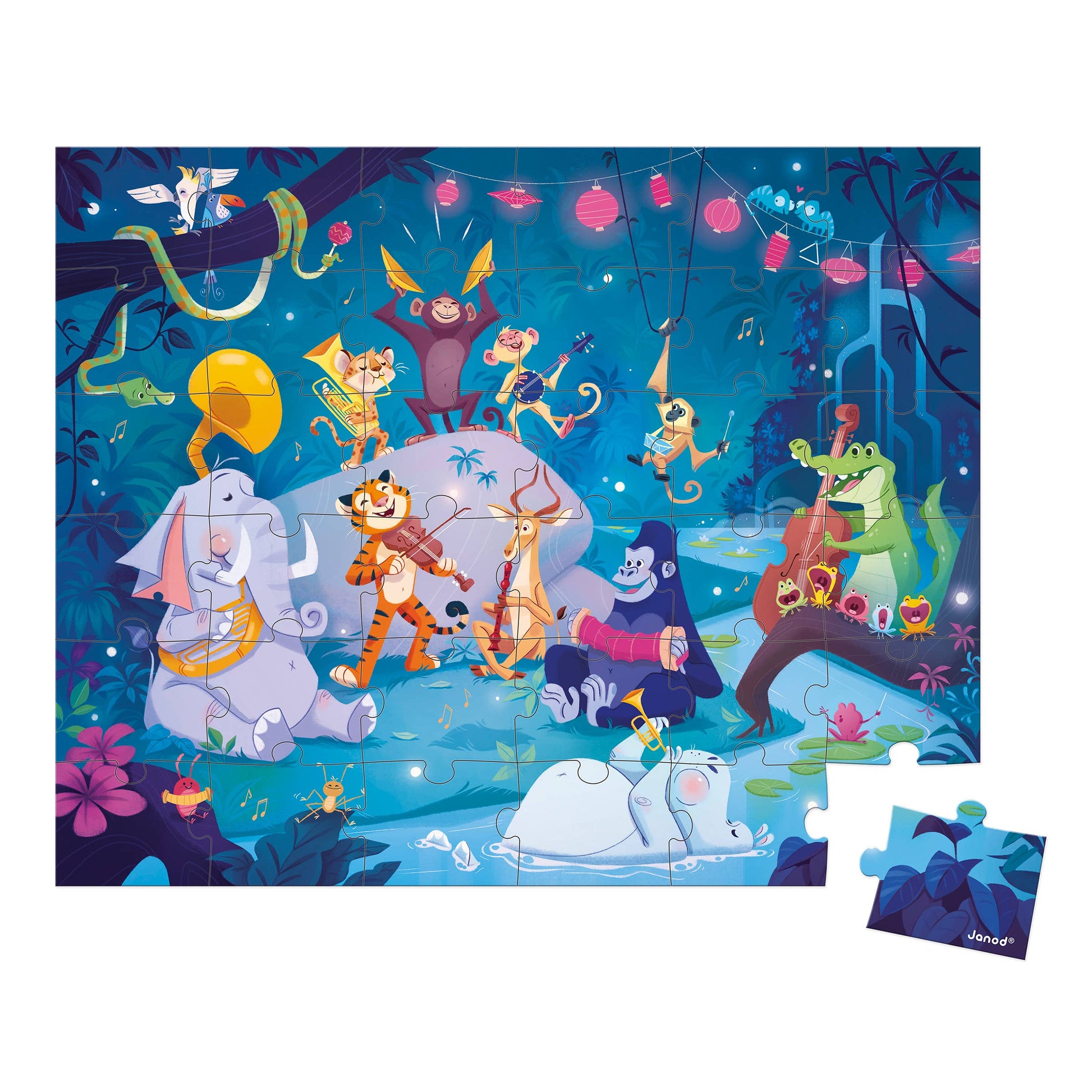 Take your child for an open-air concert deep in the jungle! A musical and enchanted journey with this magnificent 36-piece cardboard puzzle with lots of details and festive colors. Your child will develop his memory and dexterity, with this beautiful 36-piece cardboard puzzle. In its pretty little case, this puzzle will be easy to transport thanks to its fabric handle. Contains a poster that serves as a model for beginners, with the more experienced then able to complete the puzzle on their own. Made of FSCTM-certified cardboard. Puzzle for children aged 4 and over.
