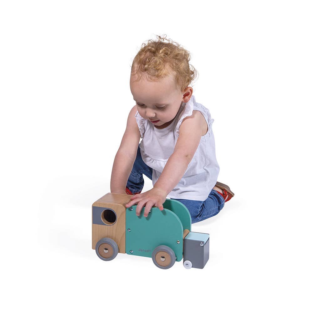 An attractive wooden garbage truck to make your child aware of ecology and recycling from an early age. This truck comes with a magnetic bin at the back, which tips up and opens so it can be emptied inside, just like a real one! The truck has rubber wheels, which are perfectly silent. Perfect for developing fine motor skills and imagination.