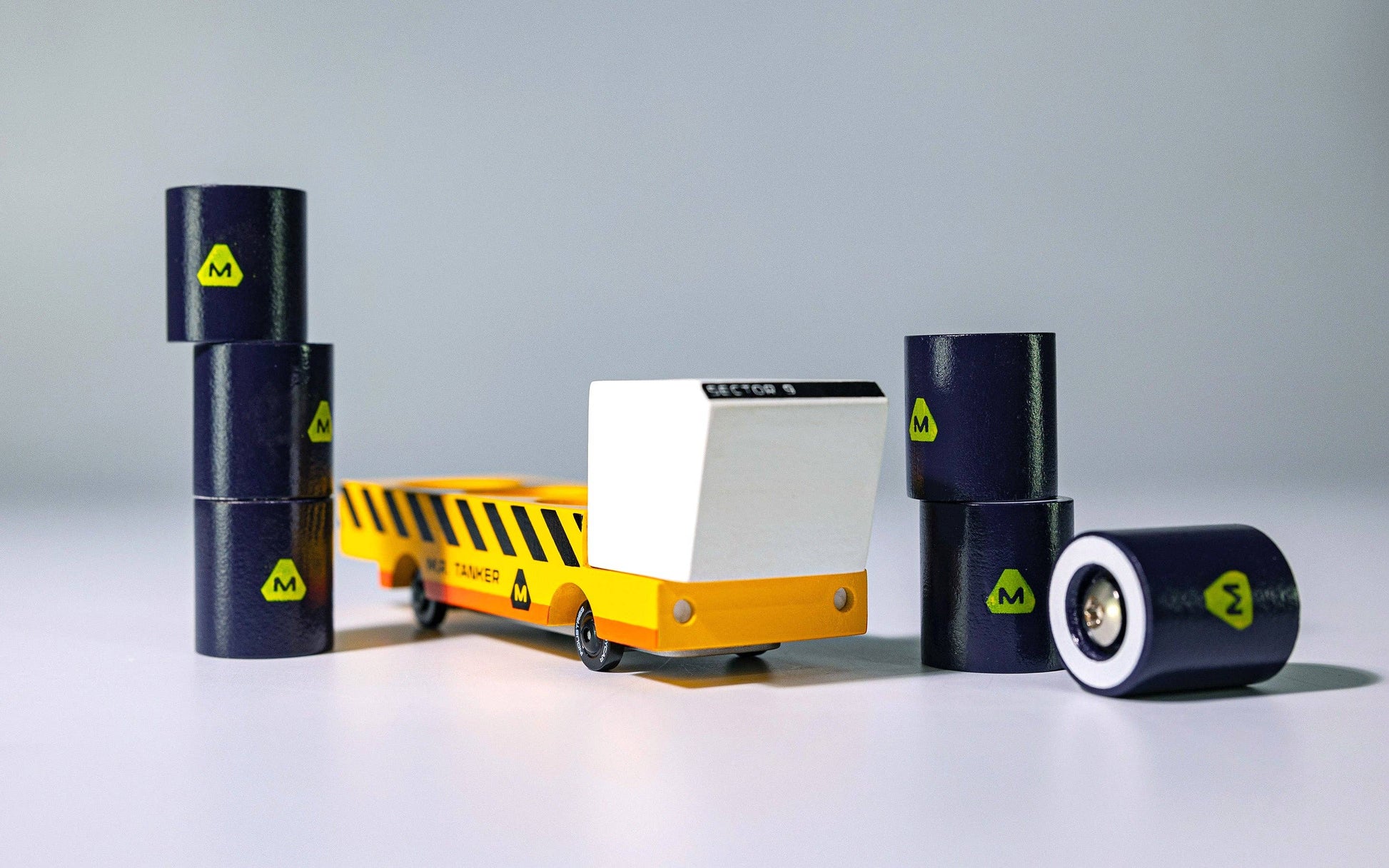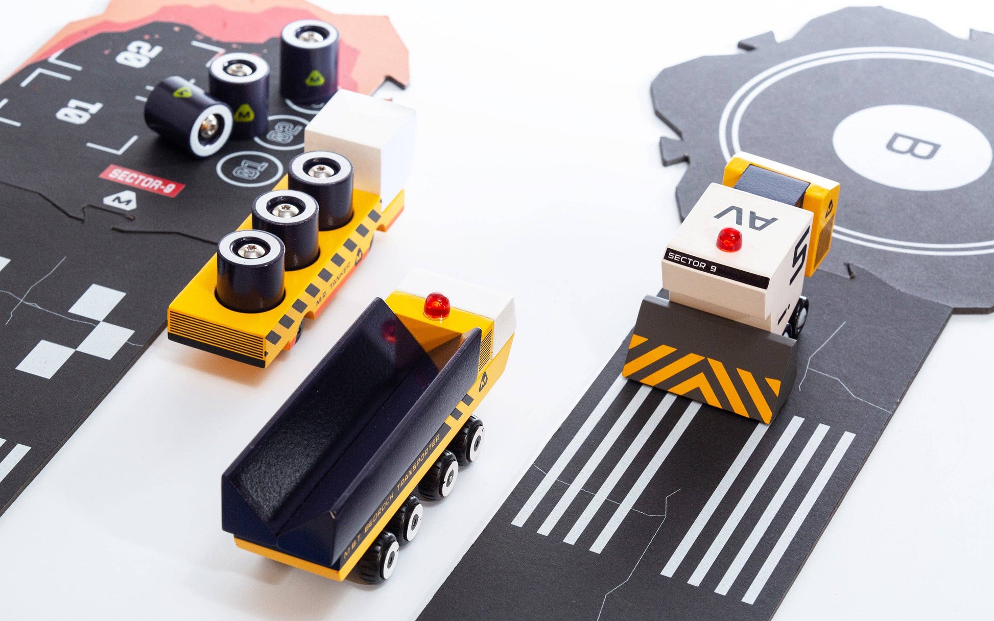 The Sector 9 play set includes the powerful and essential building vehicles of the MARGE team. The box play set includes the AV-Dozzie with a magnetic bulldozer blade, the MBT with a sespension base, M.R. Tanker with 6 magnetic fuel cells, puzzle roads, and the Sector 9 comic book.