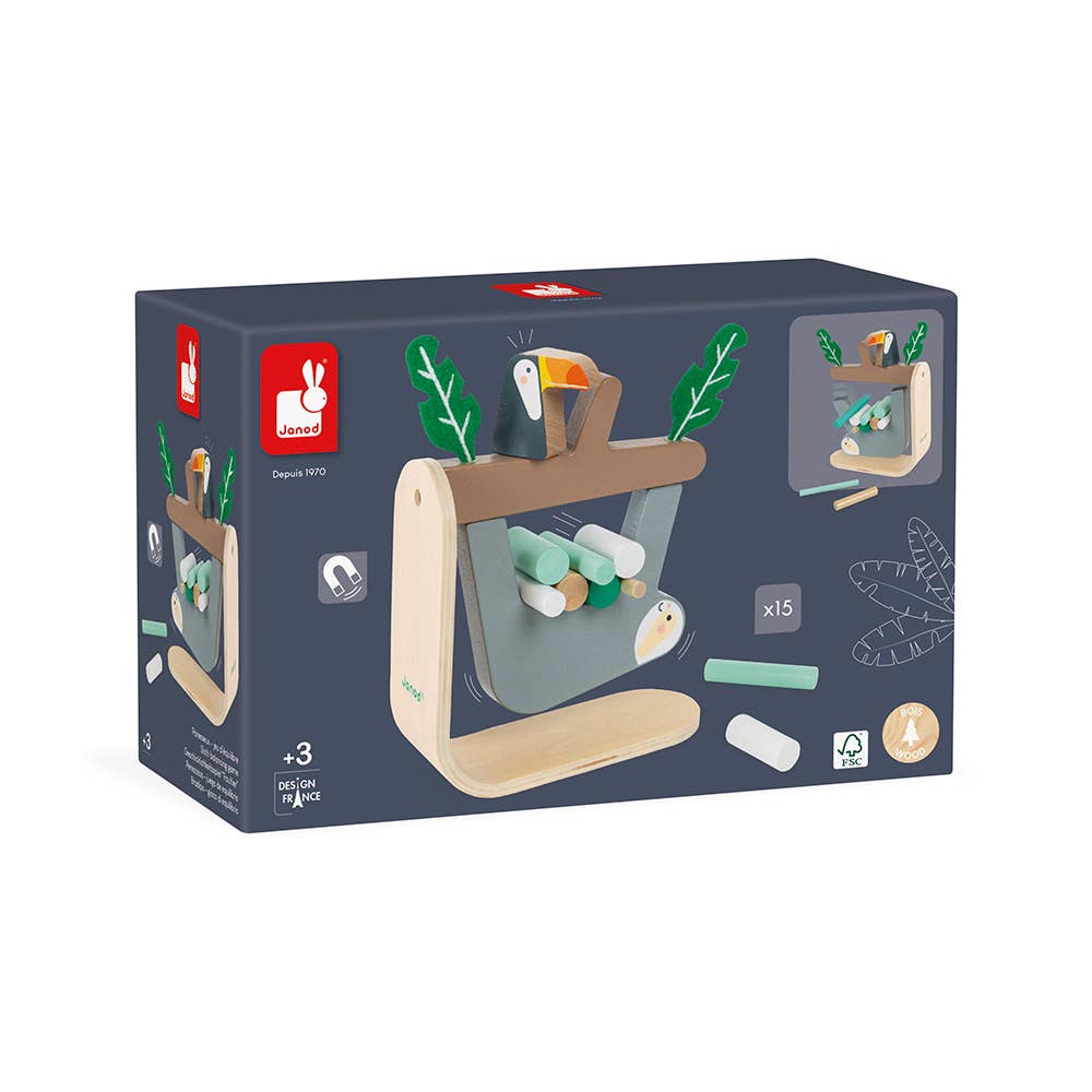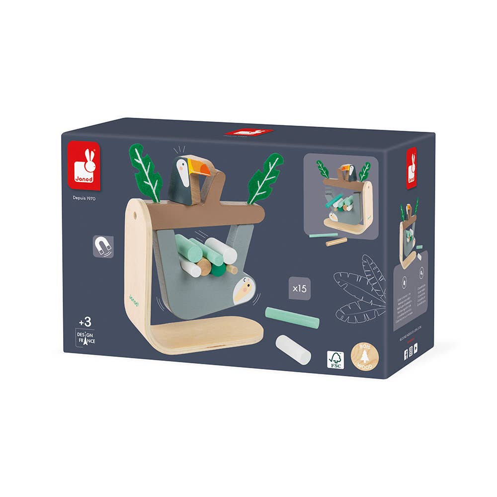 Wooden toy for children over 3 years old. Balancing game consisting of a magnetic sloth hanging from its branch and 15 sticks. For one or more players: the object of the game is to put as many sticks as possible on the sloth’s belly before the sloth lets go! The player who places the stick that makes the others tumble loses the game! Helps develop patience and dexterity.