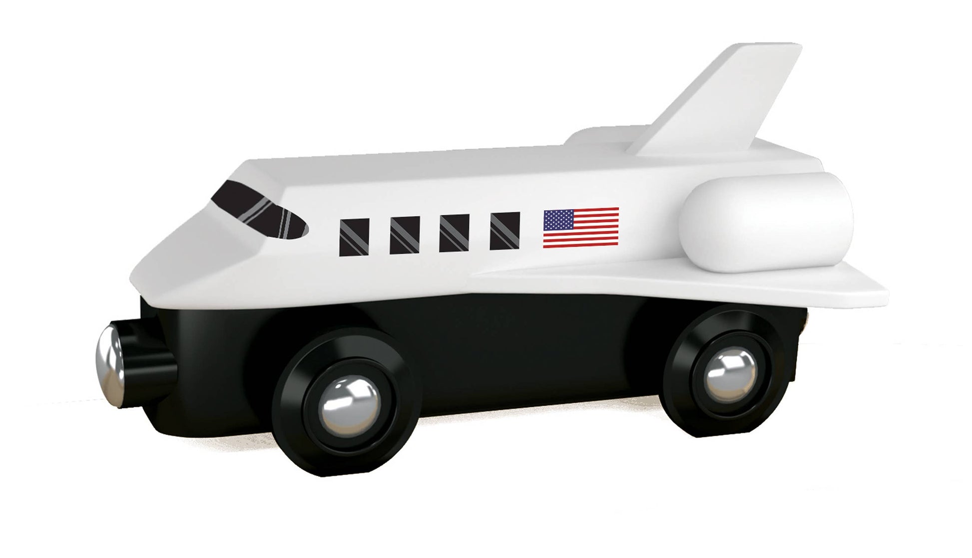 This Space Shuttle Toy Train Engine is the perfect addition to your child's wooden train track! magnetic, this train engine is compatible with most 1" tracks. With a big imagination, your child will love playing with this detailed, wood Space Shuttle train engine. Gather family and friends to enjoy this whimsical toy!