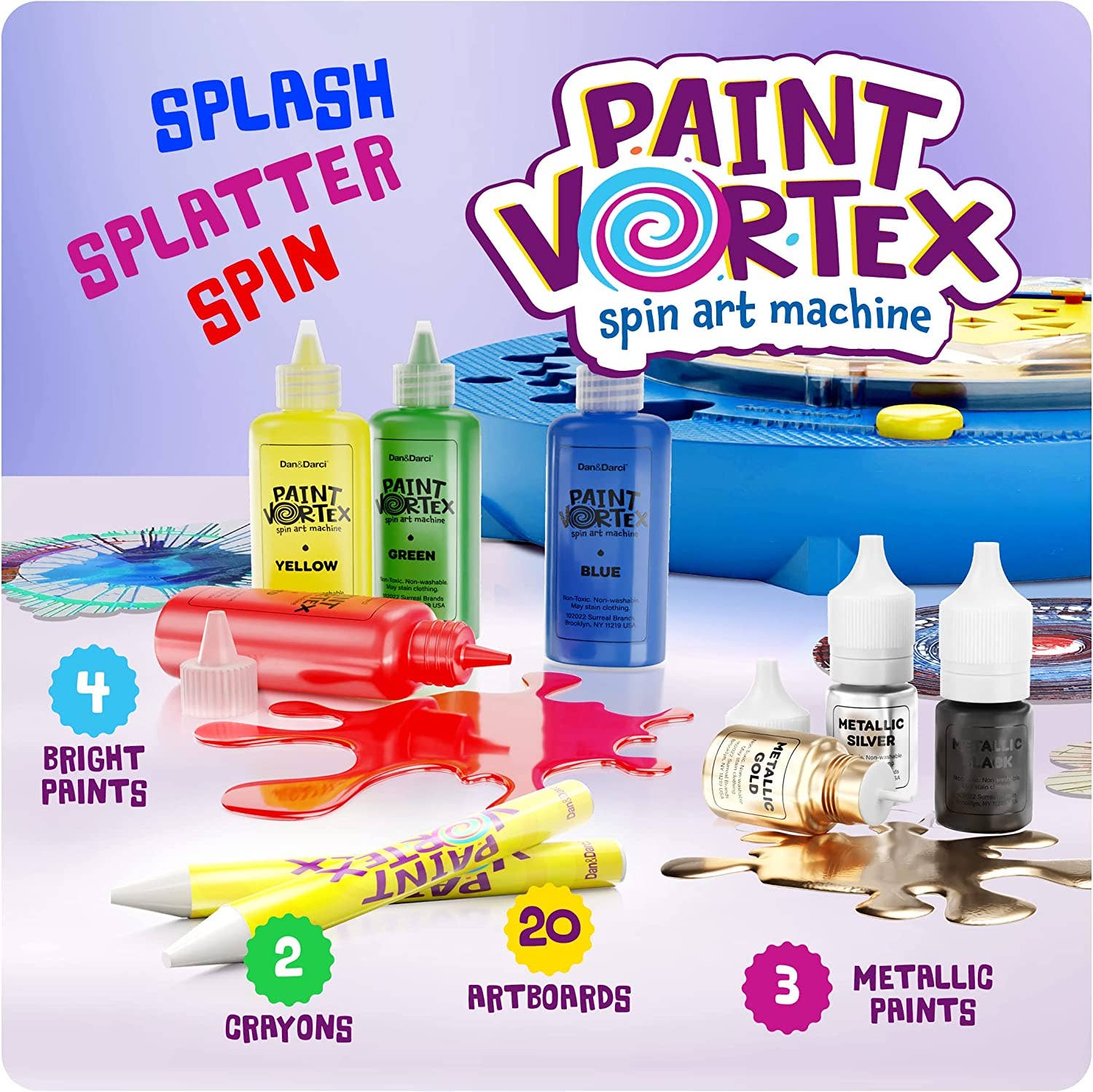 INCLUDES: Paint Vortex machine (requires 4 AA batteries - not included), splatter guard, 4 bright paints, 3 metallic paints, 10 large artboards ( in different shapes), 10 small artboards (in different shapes), 2 white crayons, instruction manual.