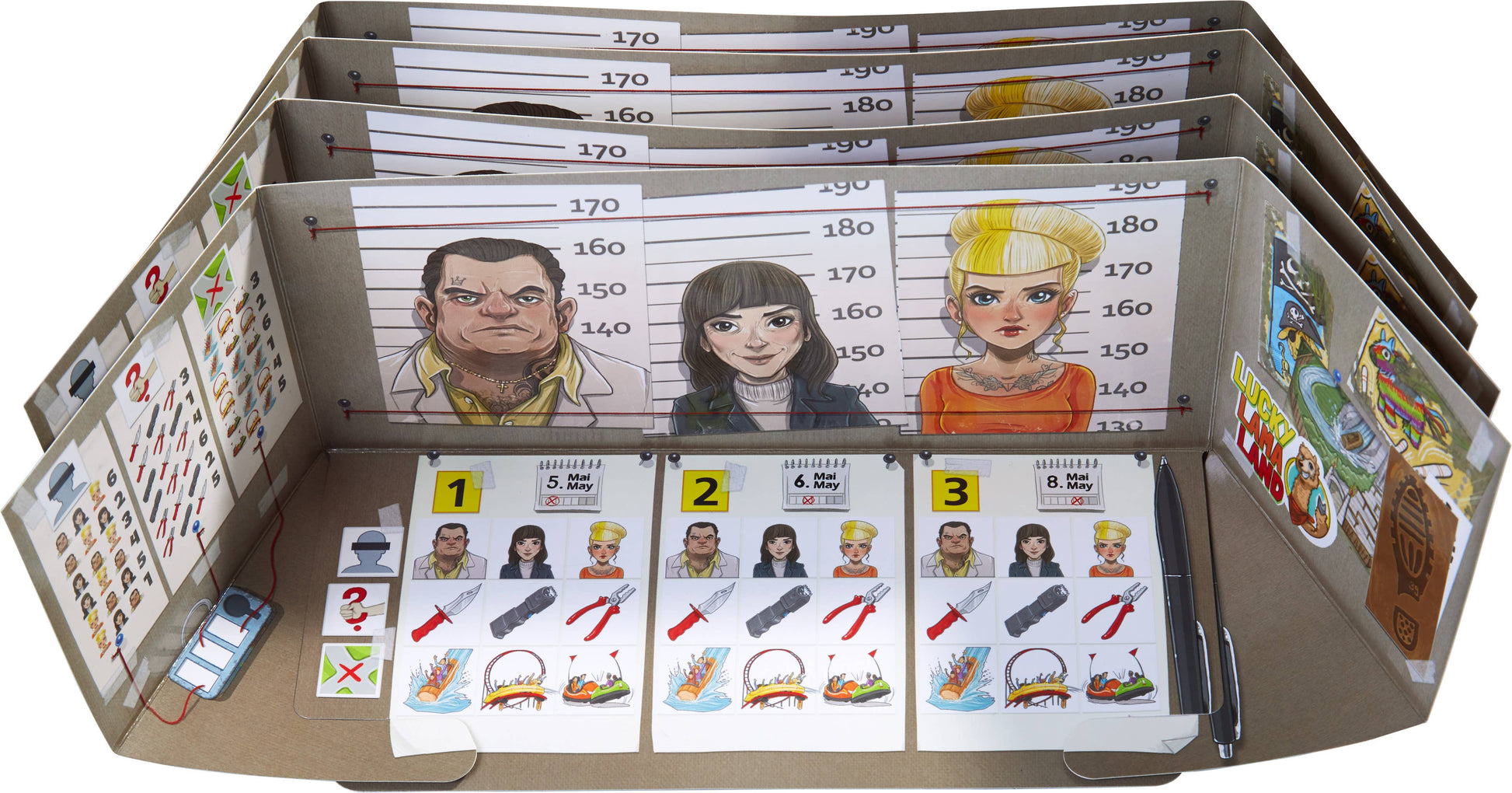 A series of sabotages has shocked Lucky Llama Land! Multiple attractions at the theme park were tampered with. Players start their investigations and combine clues about the day of the crimes, perpetrators, tools, and crime scenes. They need to generate the right number code and use the key to put the saboteurs behind bars. In the end, it's not necessarily the fastest investigator who wins the game, but the most efficient one.