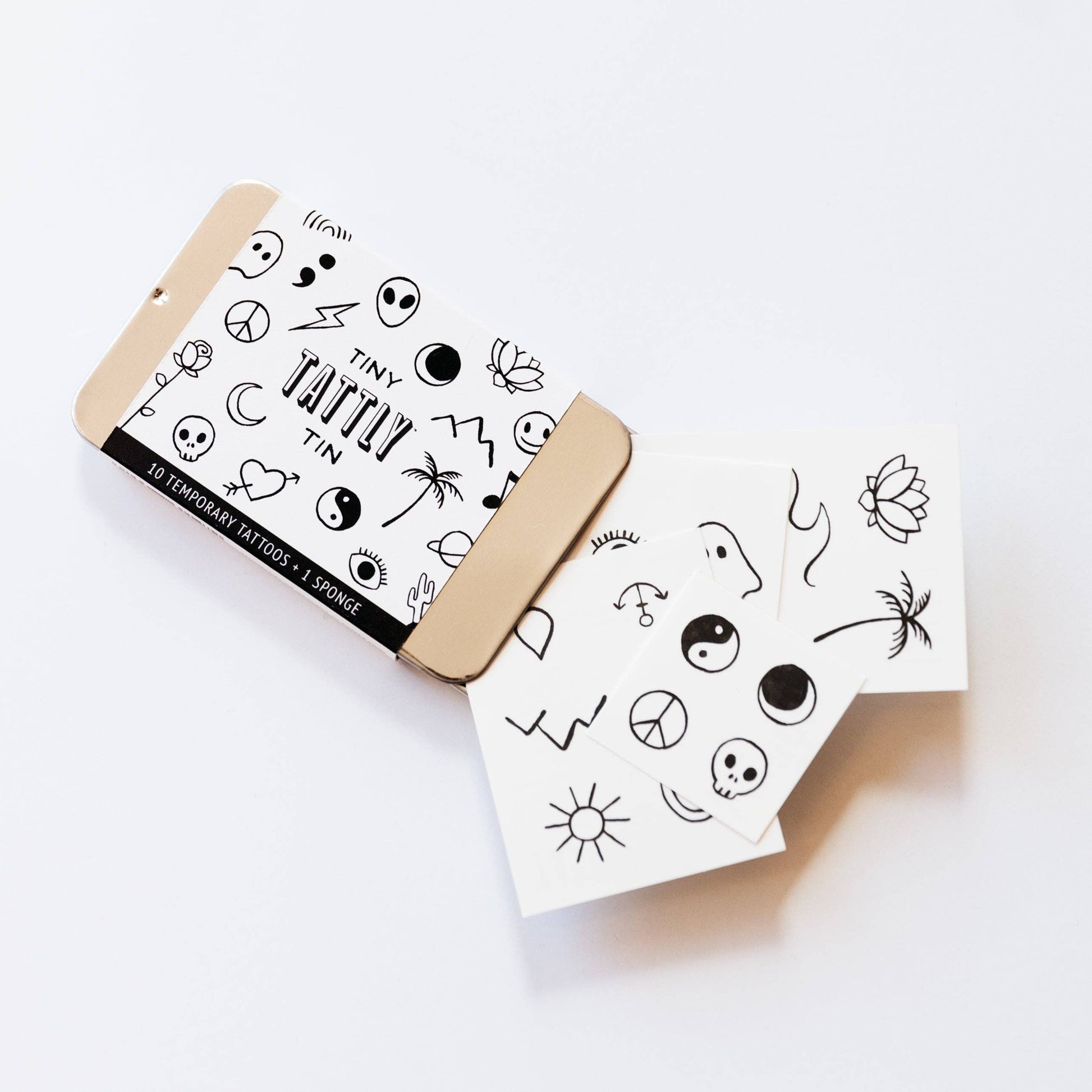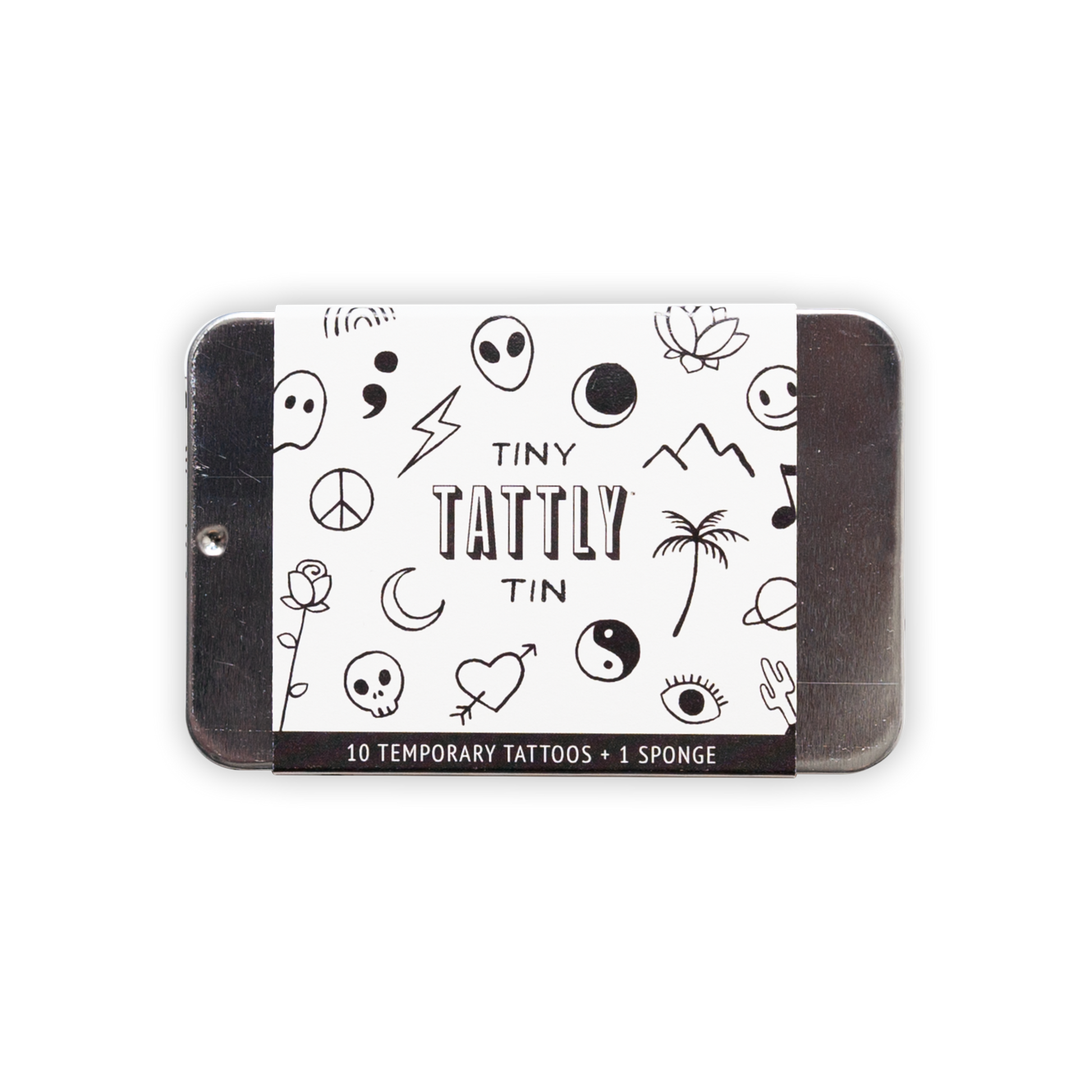 All the raddest tiny Flash Art Tattly in a mini-tini that you can take anywhere. Plus a wee sponge for easy application! Tiny Flash Art Tin from Team Tattly from Tattly Temporary Tattoos. Quality, non-toxic and made in the USA. Fake tattoos by real artists! Tattly Tiny Tins are the cutest way to tote around your Tattly! Each contains 10 Tattly and a mini sponge, packaged in a reusable slide-top tin with paper belly band. Tin size: 3.6"x2.4"x0.5".