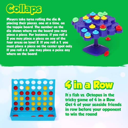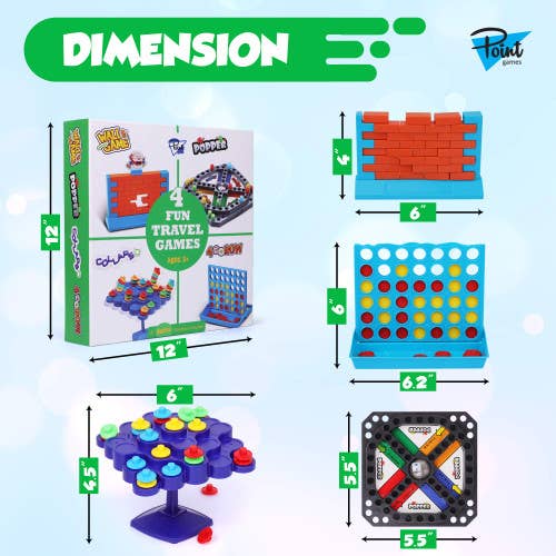 Packing for a trip with kids has never been made simpler. With this convenient and manageable board game set, you can easily include hours of fun and entertainment for the kids stress-free. Featuring four popular and classic games, this high quality assortment of board games is guaranteed to provide hours of entertainment and fun for the little ones.Includes: 1x Wall Game, 1x Popper Board Game, 1 x 4 in-a Row Game, 1x Collapso balancing GameSpecs and Details: Great for kids ages 5 and up. Not suitable for toddlers. Box Dimensions: 12'' x 12''FAMILY BOARD GAMES: Planning a family party games night? This set is a perfect addition to challenge kids with an activity that will make them slow down, think and practice their creativity and fine motor skills. Increase the parent-child interaction and promises entertainment for all family member.