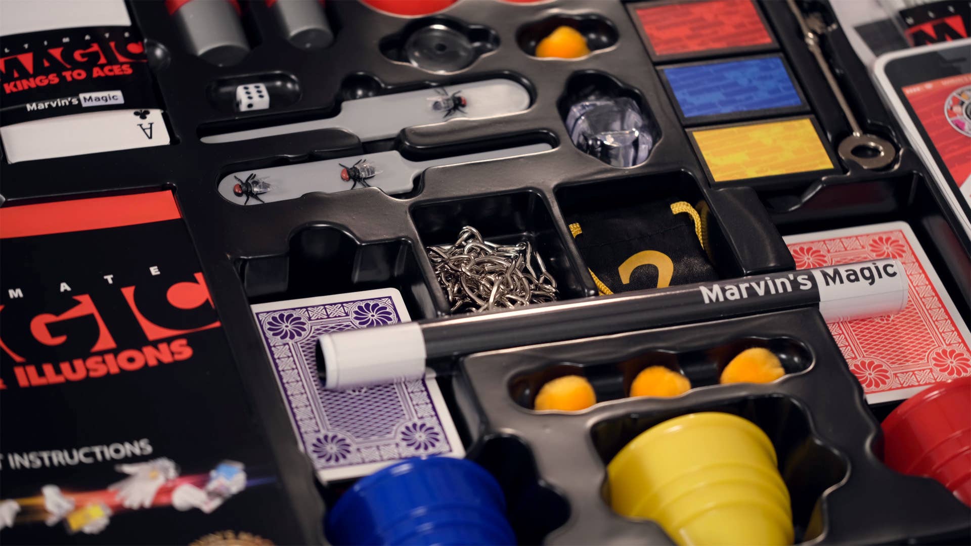 Inside, budding performers will discover favorites like the Amazing Magician’s Cards, Cups and Balls, Astounding Mind-Reading Canisters, Houdini Chains, the Haunted Key, Fly Paddles, and much more. Complete with a fully illustrated instruction booklet, this set makes learning easy and fun.