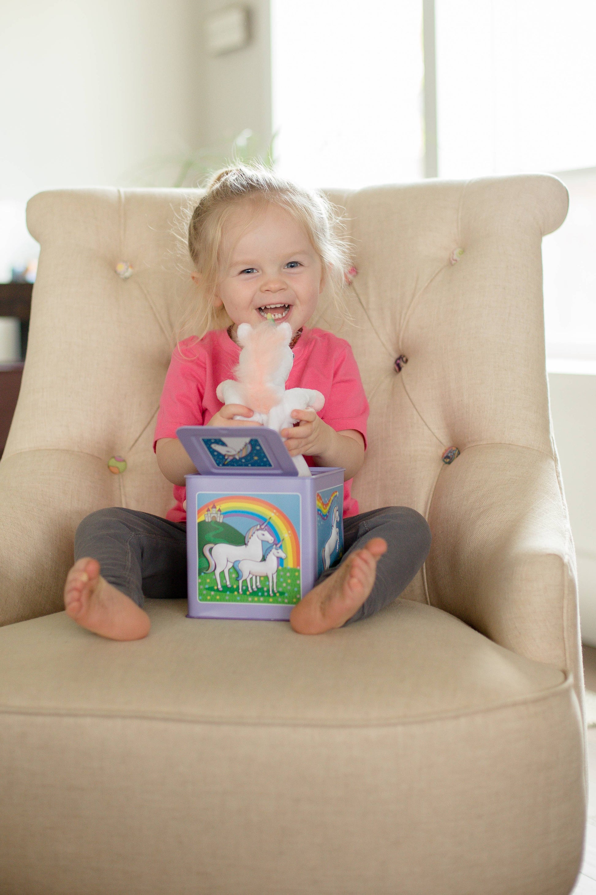 Jack-in-the-Boxes have been a time-honored favorite toy since the 1500’s! Jack Rabbit Creations creates a twist on this classic, with all original art, cuddly plush characters, and unique play-along songs. Surprise your youngsters with this Unicorn Jack in the Box that plays “Twinkle Twinkle Little Star”.