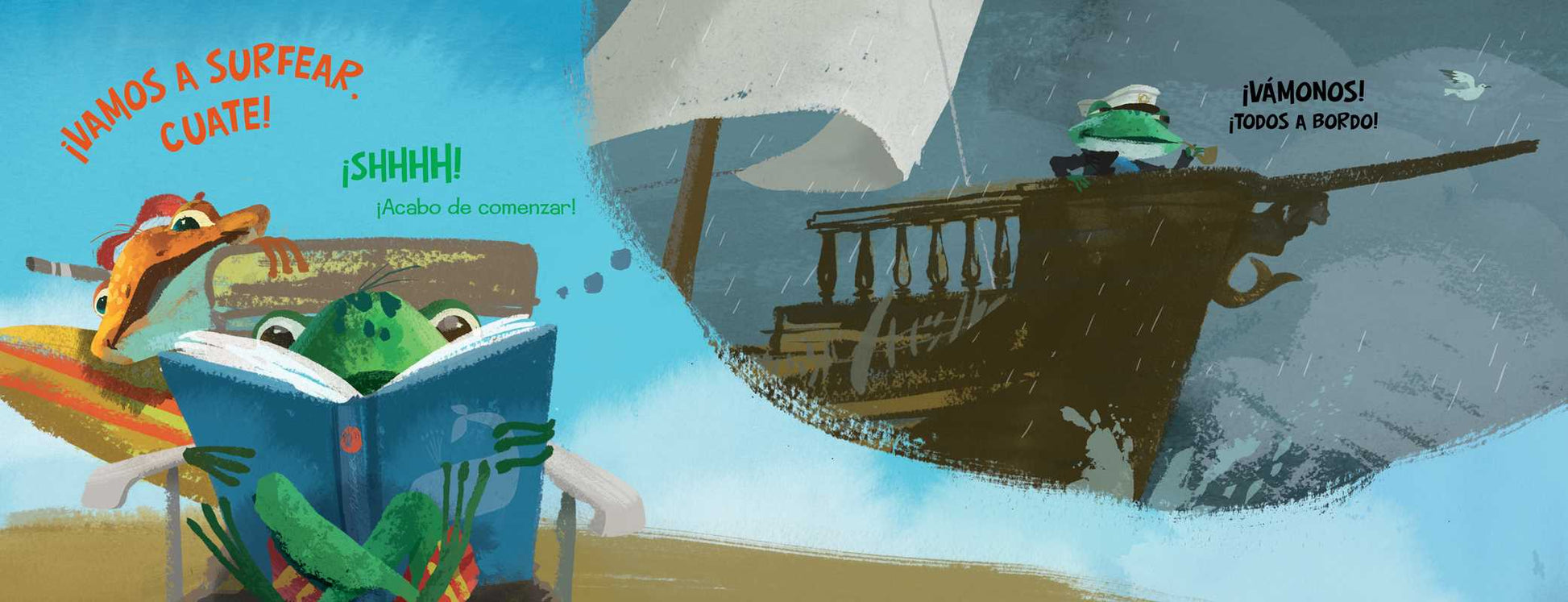 Surf’s up, Bro! Not yet, Dude. Books are boring. Not this one! The Spanish edition of Newbery Award winner and #1 New York Times bestselling author Kwame Alexander's nautical ode to the joy of reading. ¡Vamos a surfear, Compa! Todavi´a no, Cuate. Los libros son aburridos, Compa. ¡Este no, Cuate! La edición en español de la oda náutica al placer de la lectura por Kwame Alexander, ganador del Premio Newbery y autor número uno en ventas del New York Times. Bro and Dude have very different ideas about how to spend a day at the beach. But as Bro continues to gasp and cheer while he reads his book (Moby Dick), Dude can’t help getting pulled in—literally. Before you can shout “Surf’s up!” both frogs are sharing the same adventure—that is, until they get to the beach.