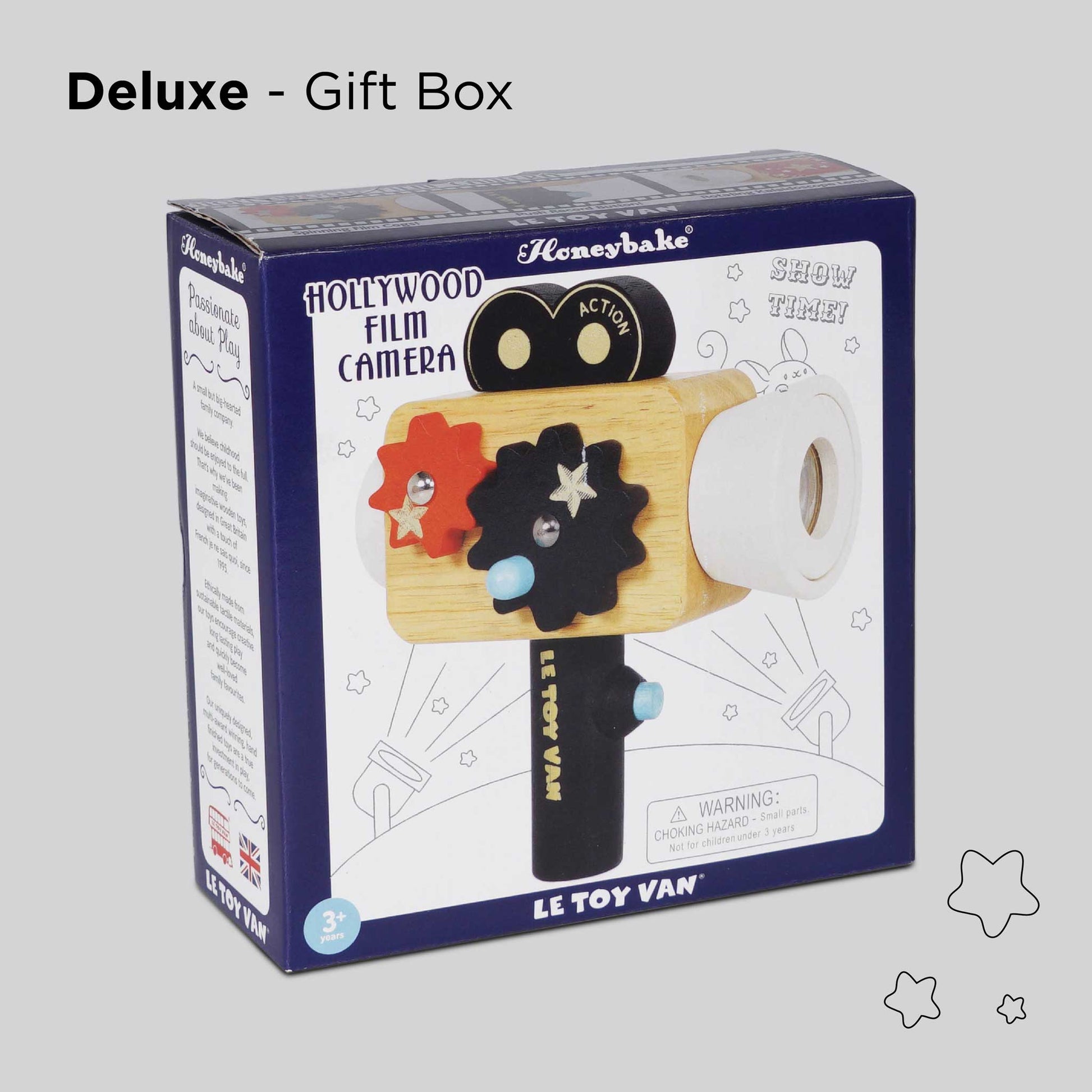 Lights, camera, action! Hollywood is calling for budding young actors or film directors with this dazzling film camera. Let little imaginations run wild as they find their inner movie star with this stimulating wooden toy, an ideal way to encourage language and social development skills. Designed by our talented toy makers, this vintage-style camera has a striking look complete with spinning cogs and a kaleidoscopic lens for extra layers of discovery. Pair with either of our Puppet Theatres for the ultimate at home movie extravaganza.